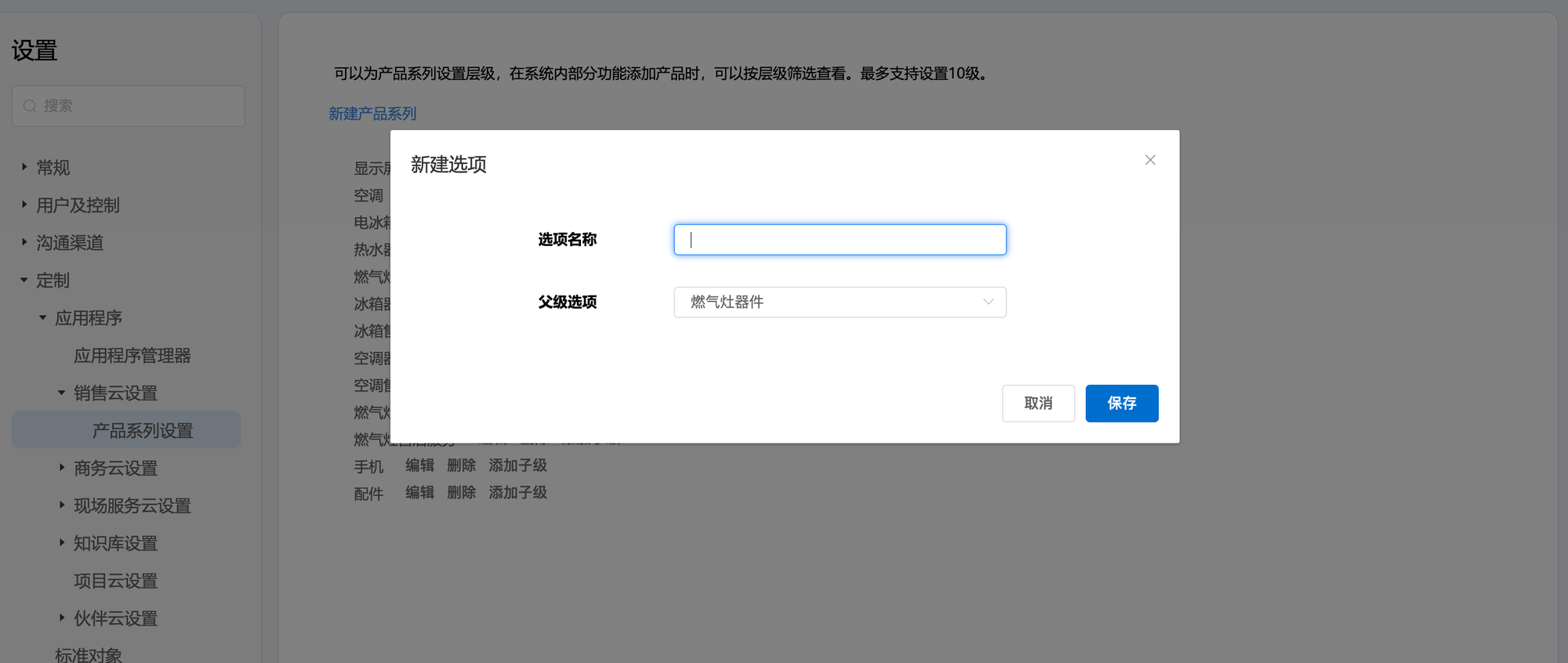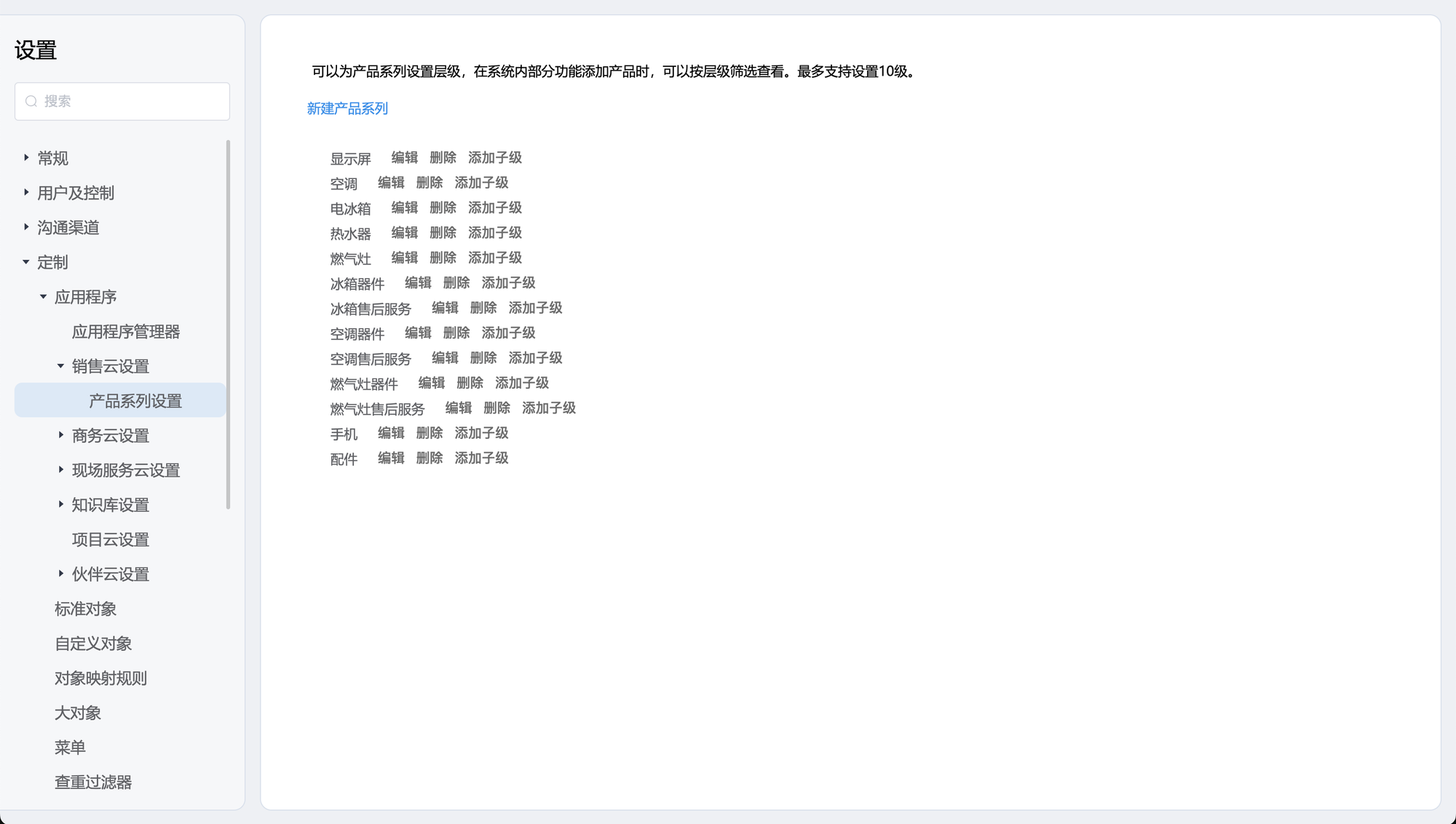 2.定制⇒销售云设置⇒产品系列设置,进入产品系列设置页面。