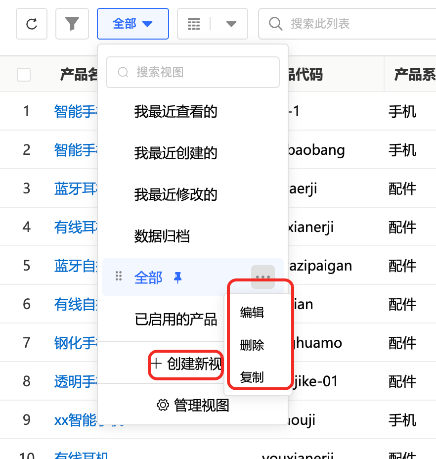 (3)使用列表视图控制菜单来创建、编辑、删除视图,排序拖动顺序即可完成排序。