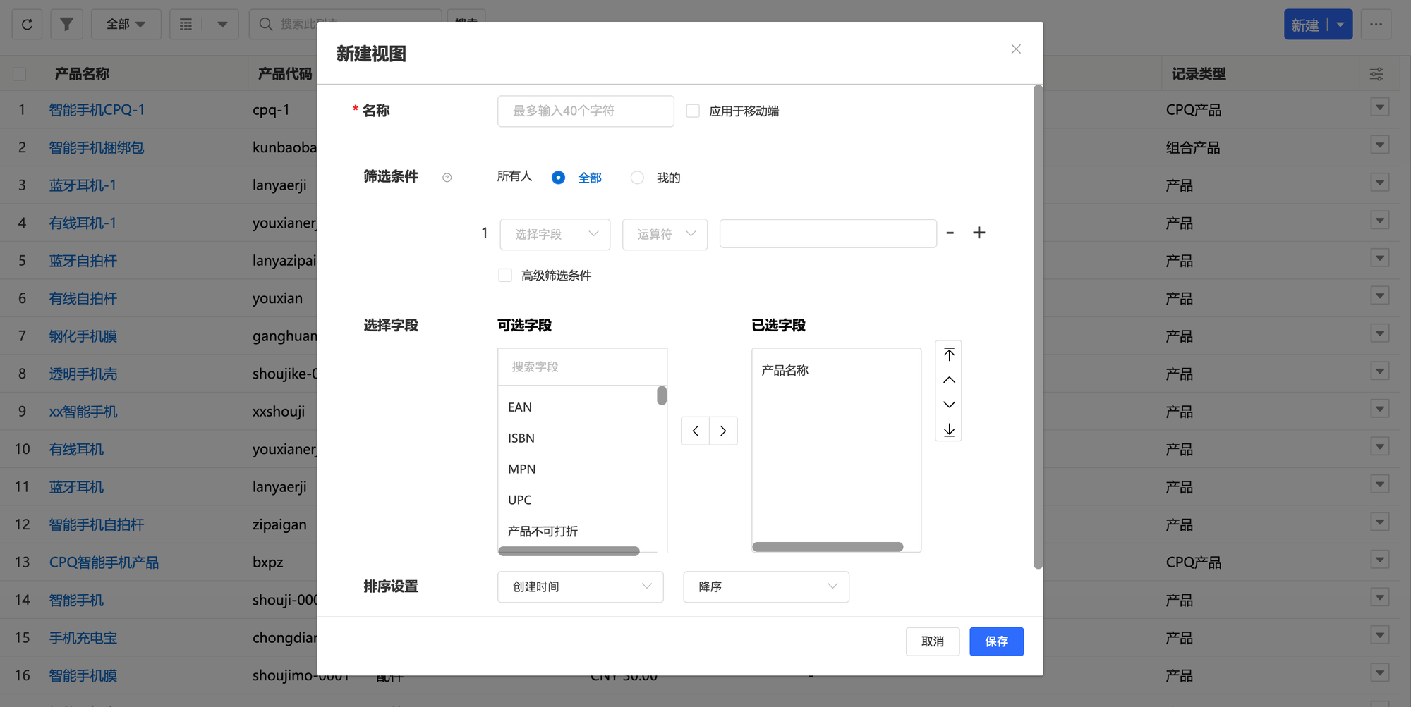 (4)点击“创建新视图”打开视图创建弹窗,输入名称、设定筛选条件、选择视图显示字段并设定可见性。点击“保存”后完成视图创建。