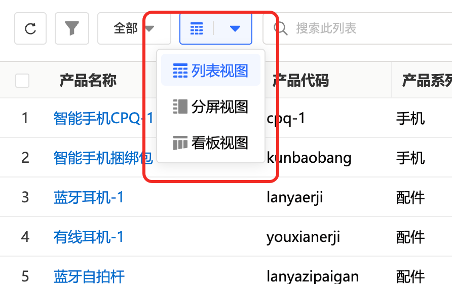 ①可使用不同方式查看数据。右上角的列表视图、看板视图和分屏视图为用户提供三种数据显示方式。
