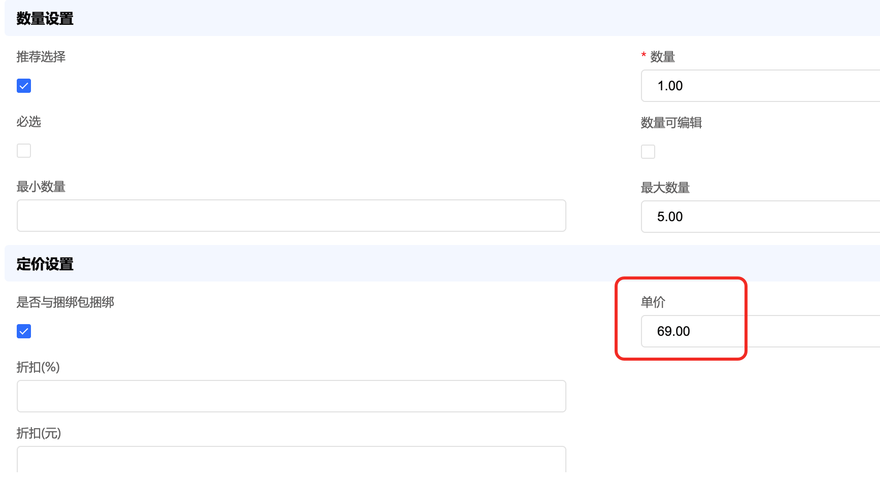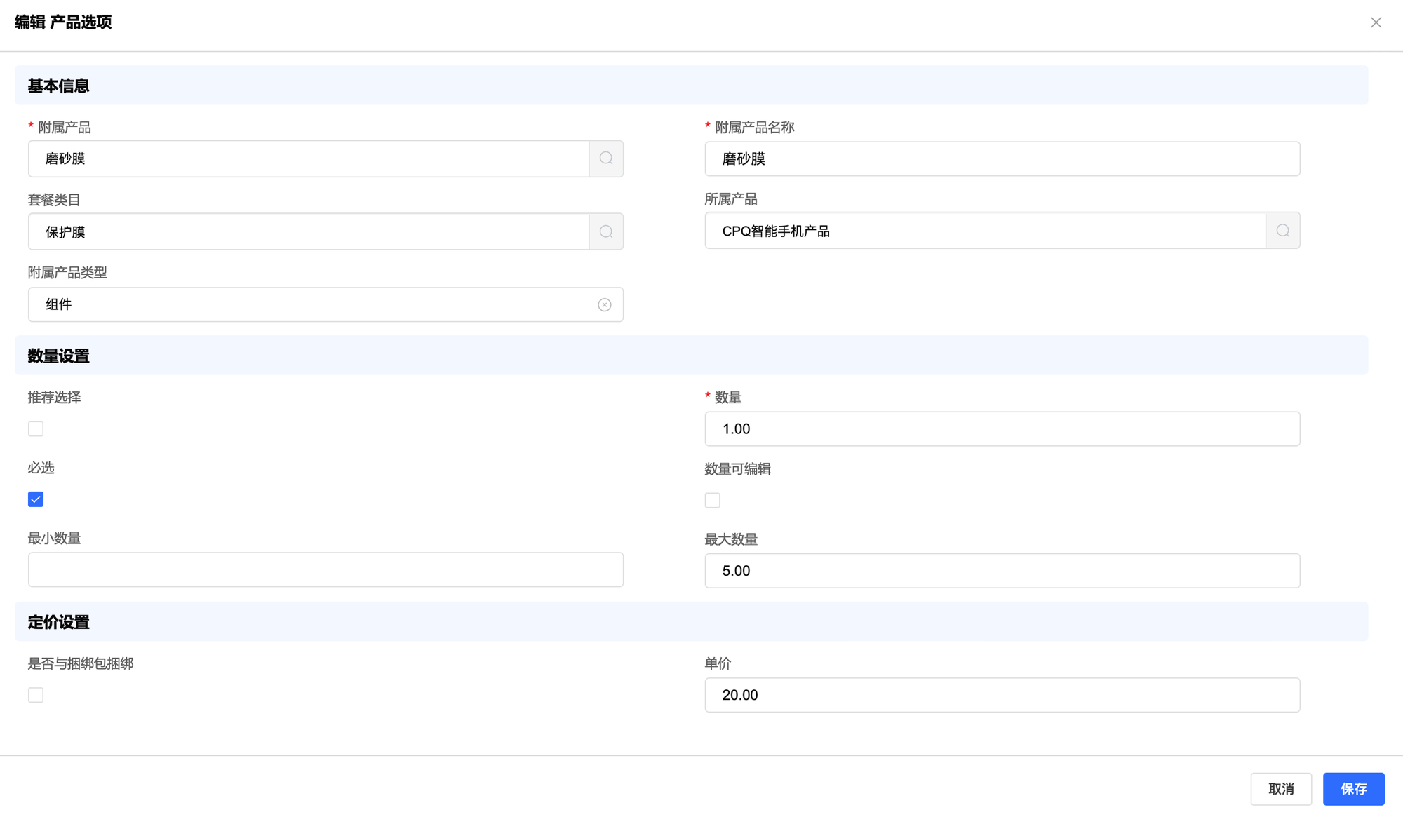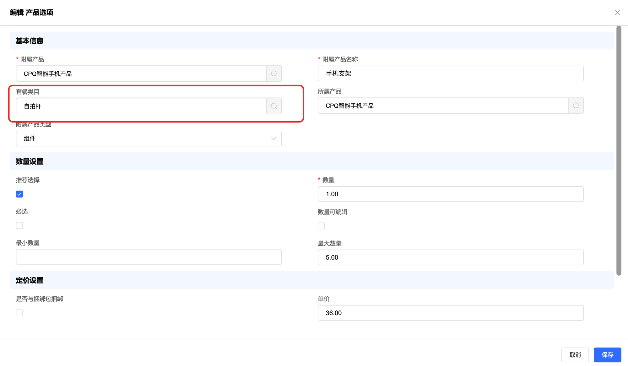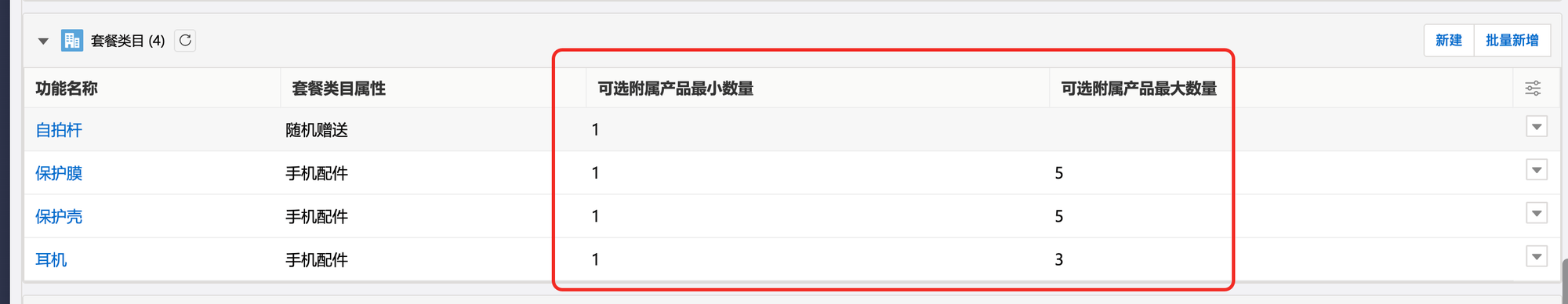 ② 附属产品最小数量/最大数量:每个套餐类目下可以捆绑销售的最小/最大附属产品数量。