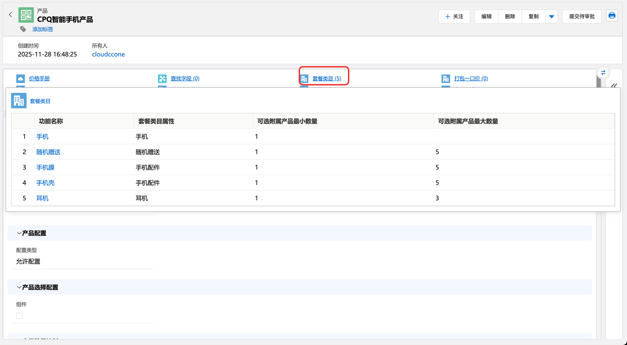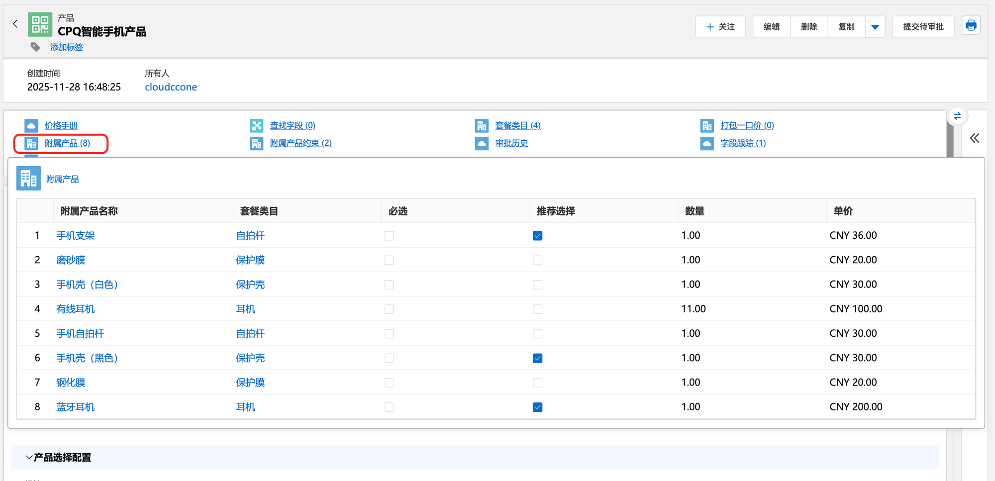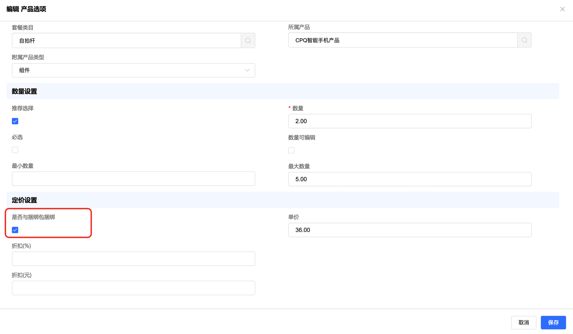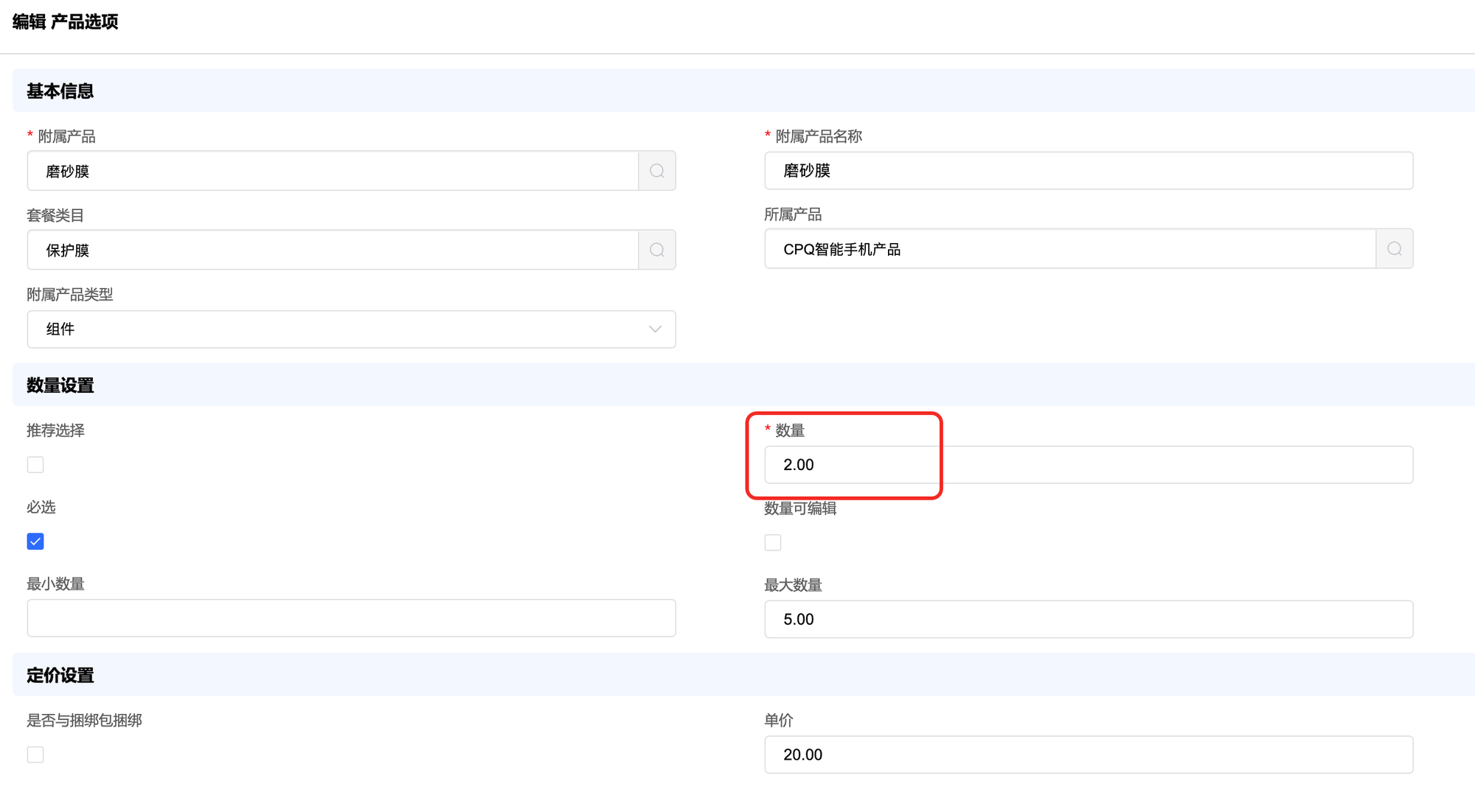 • 必须配置:在报价时,若选择添加该产品至报价单,则必须跳转到配置产品页面,配置该捆绑包下的子产品及其数量。