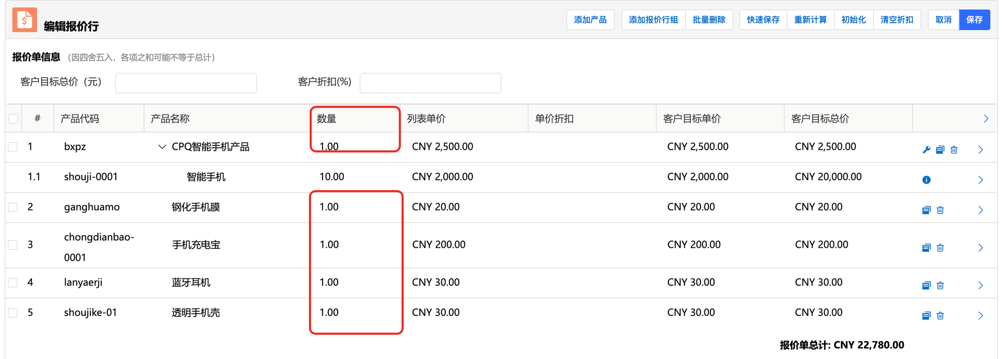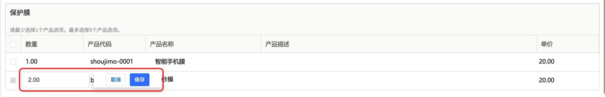④ 数量可编辑:复选框默认不勾选时,报价时,产品数量为只读,不可编辑。 勾选之后数量才可以编辑。