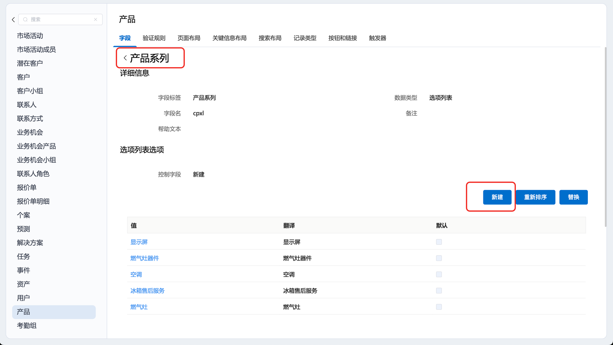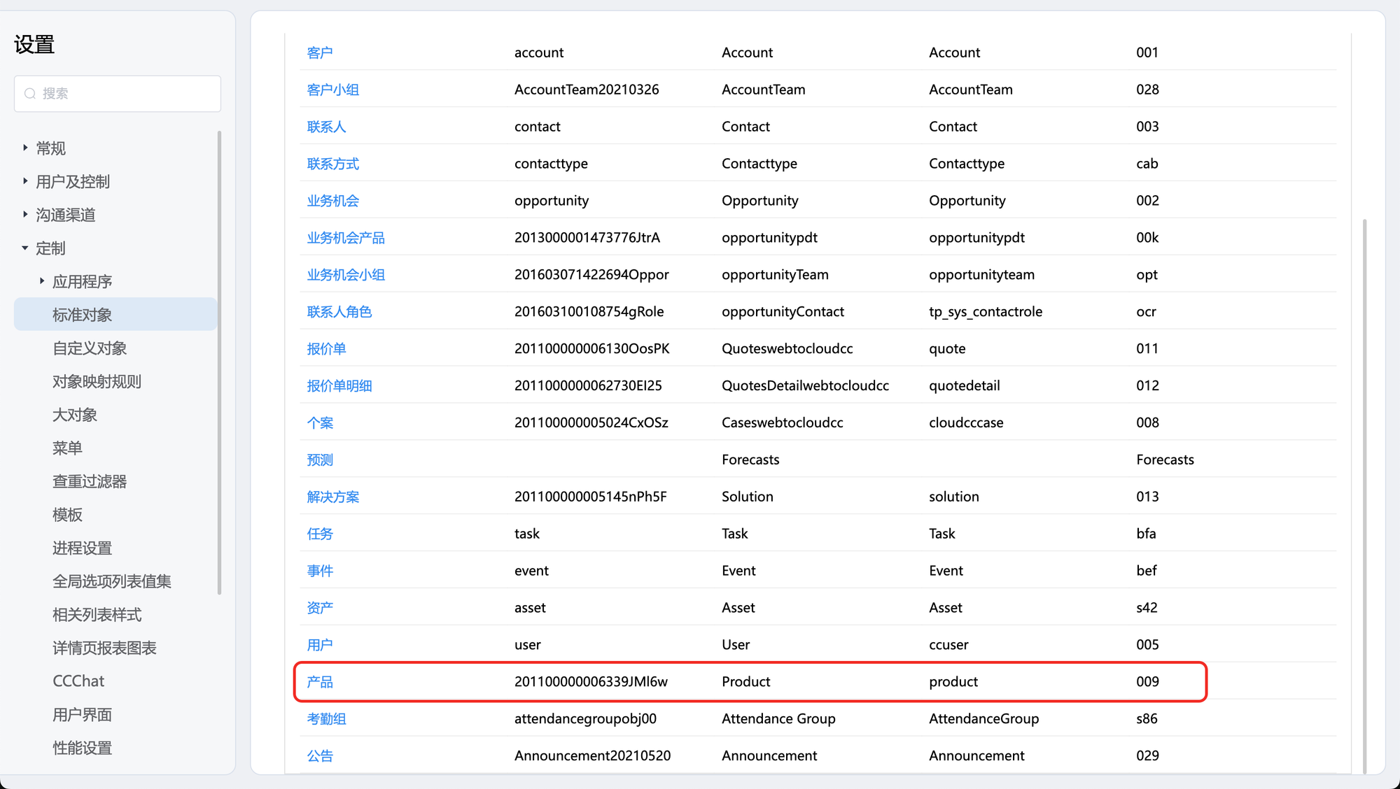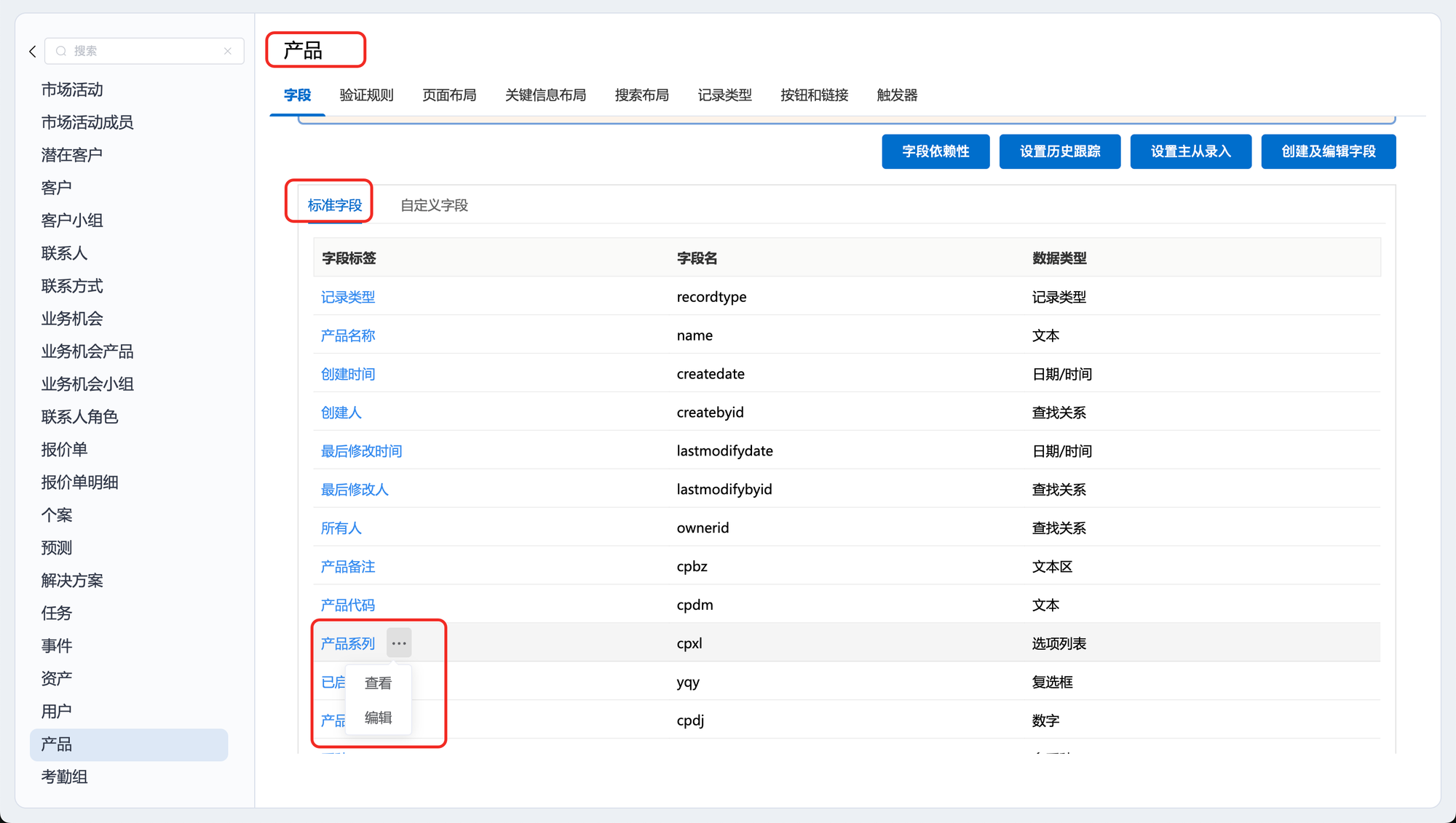 步骤 2:在应用程序设置页面,定制->标准对象,在销售云tab下找到产品对象,进入产品对象设置页面。