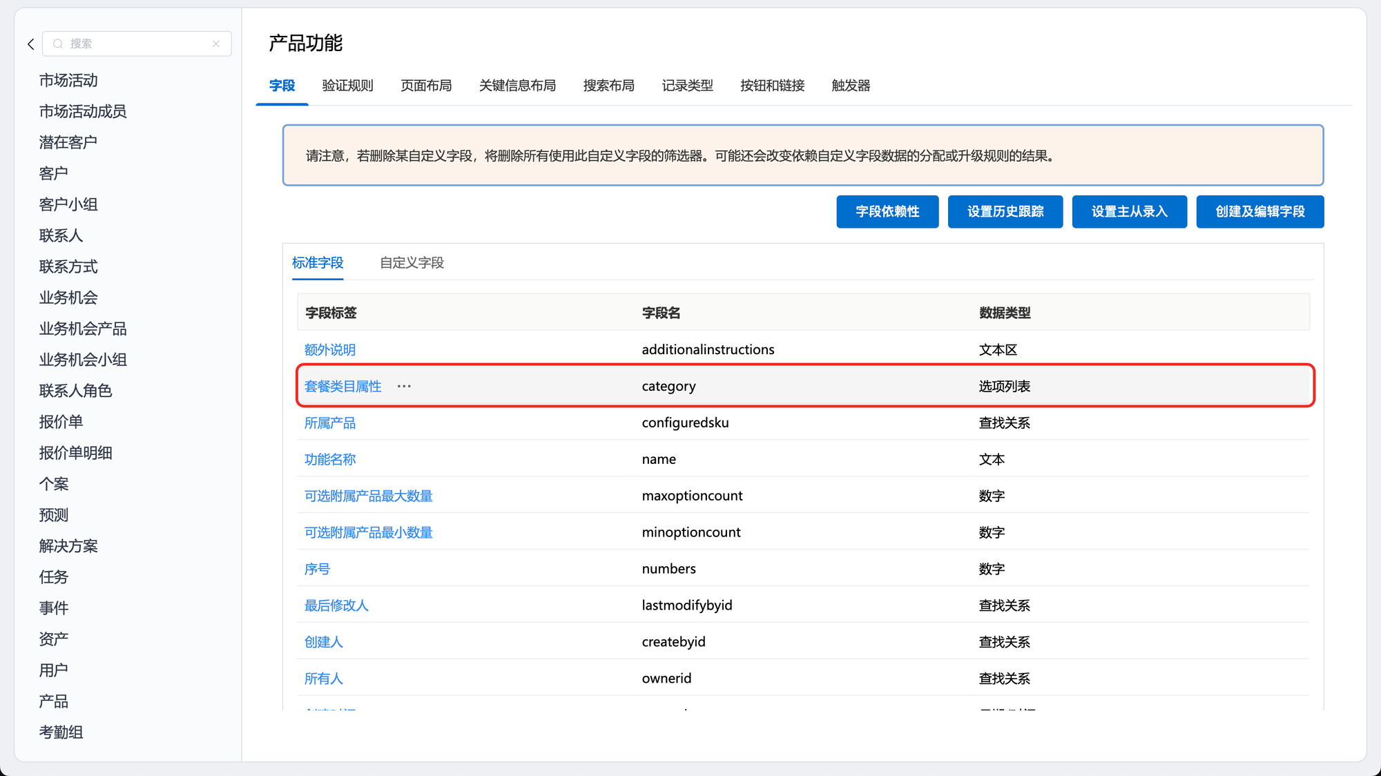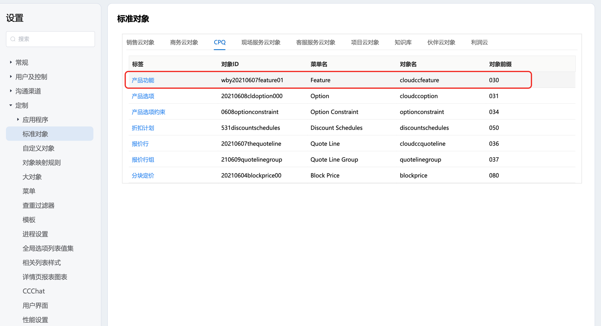 步骤2:在应用程序设置页面,定制->标准对象,在CPQ tab下找到产品功能,进入产品功能设置页面。