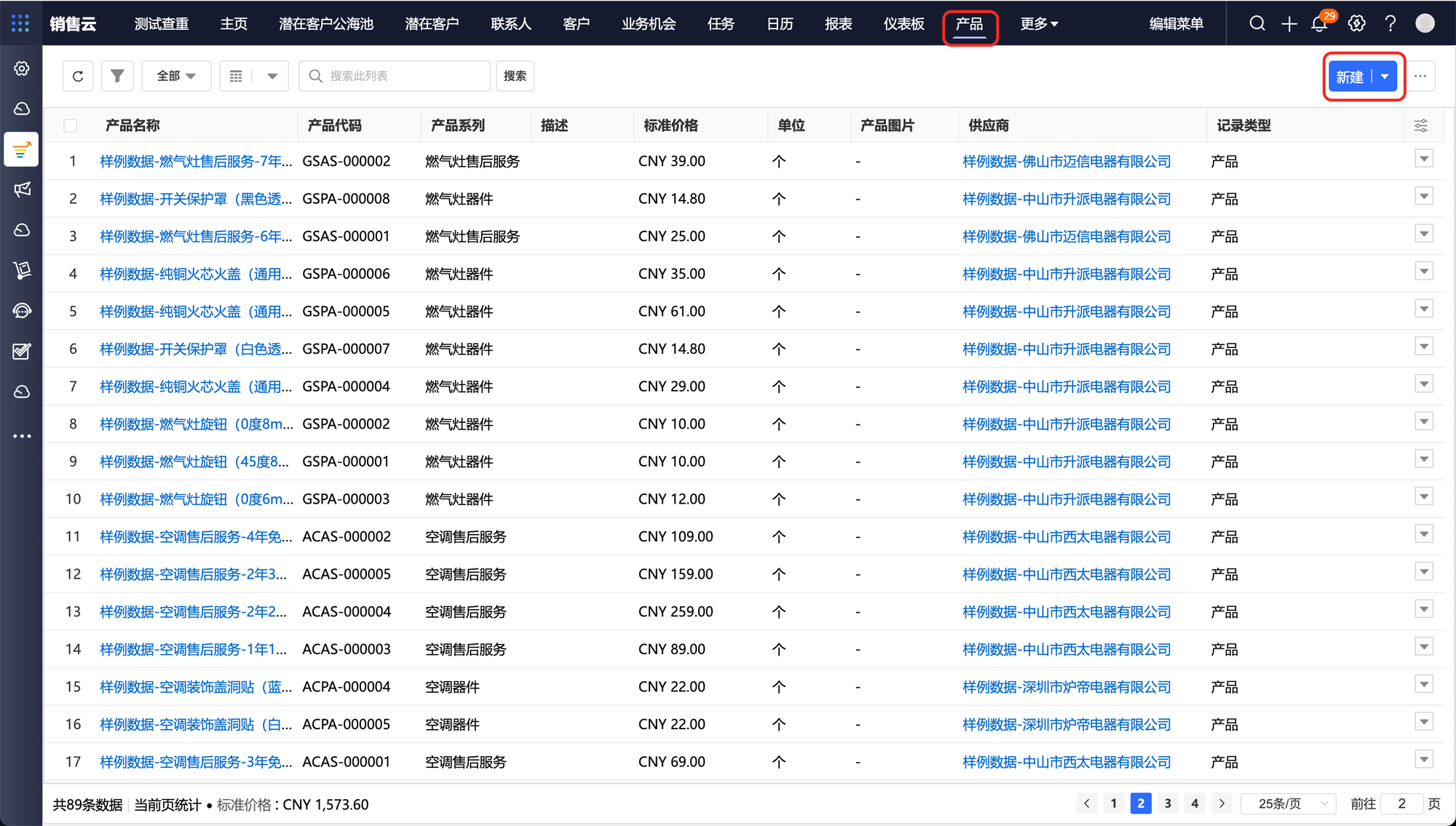 步骤 1:点击产品列表页新建按钮,新建产品记录,可以对产品基本信息进行全面的维护。