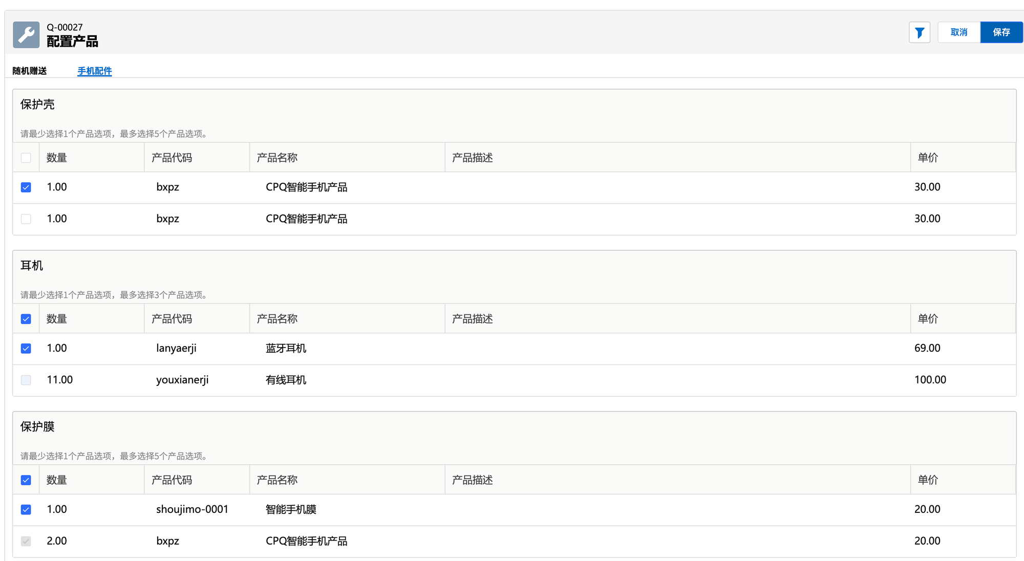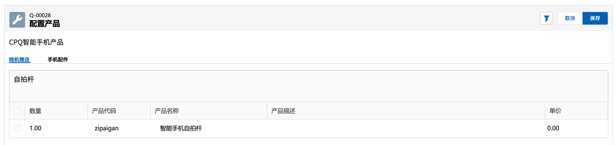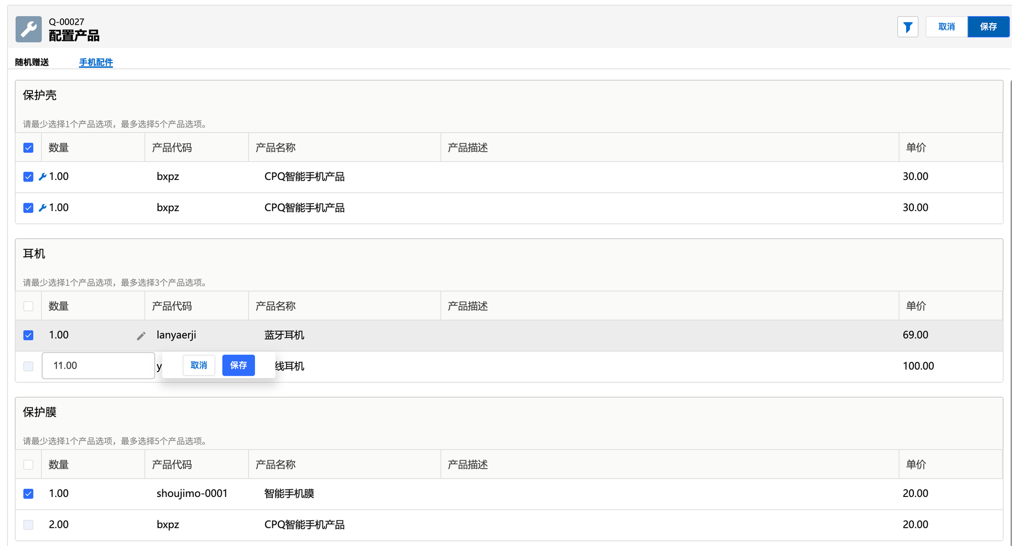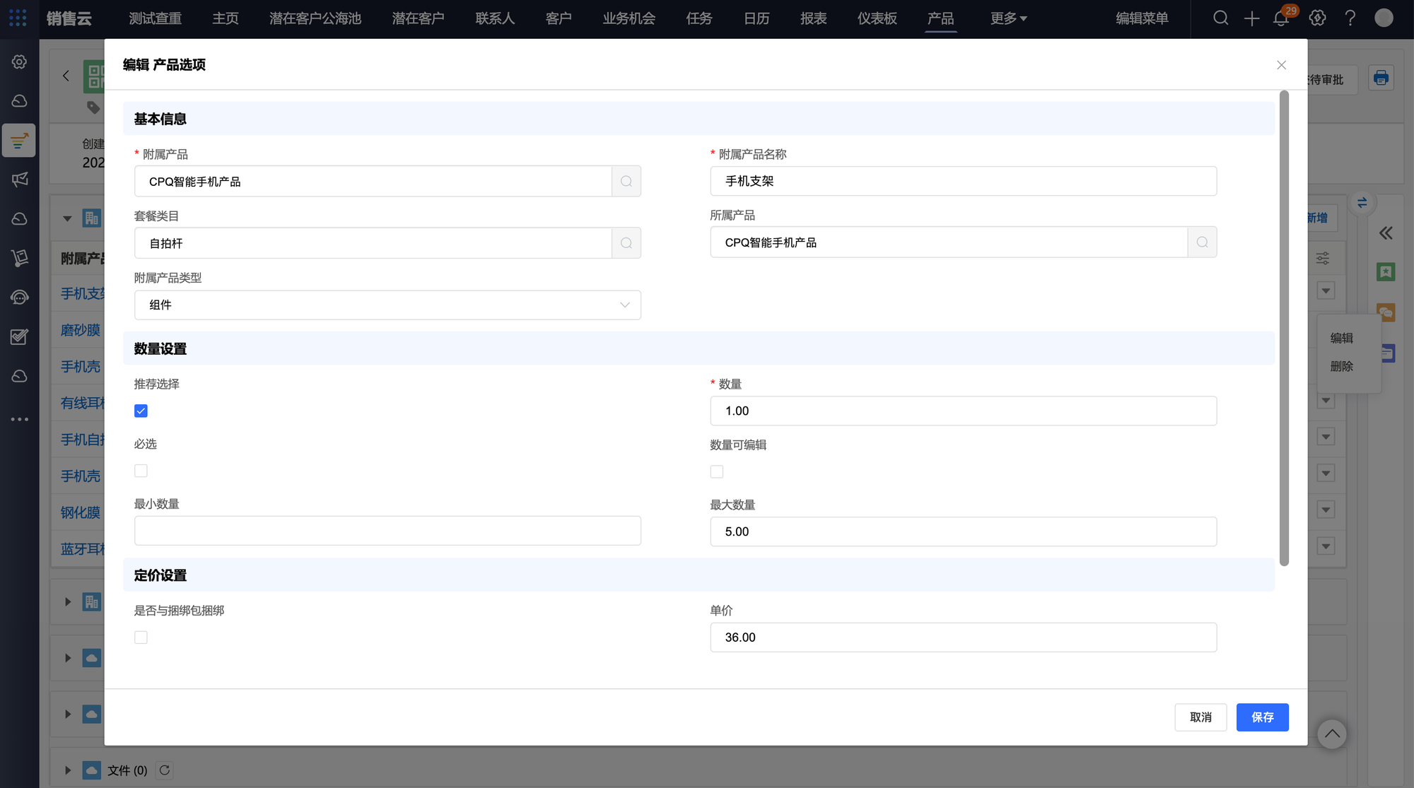 步骤 2: 在产品配置页面,配置产品下的附属产品和数量等信息。点击保存, 保存产品至报价单。
