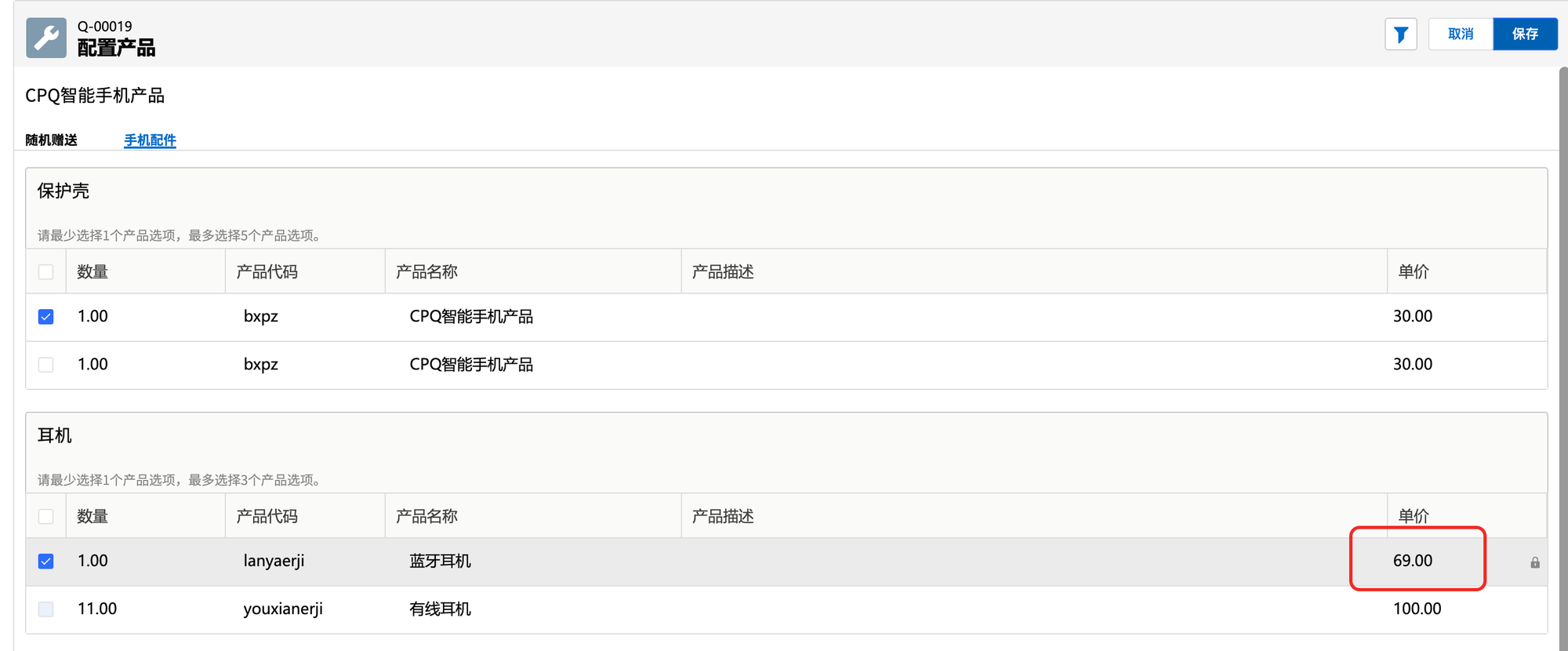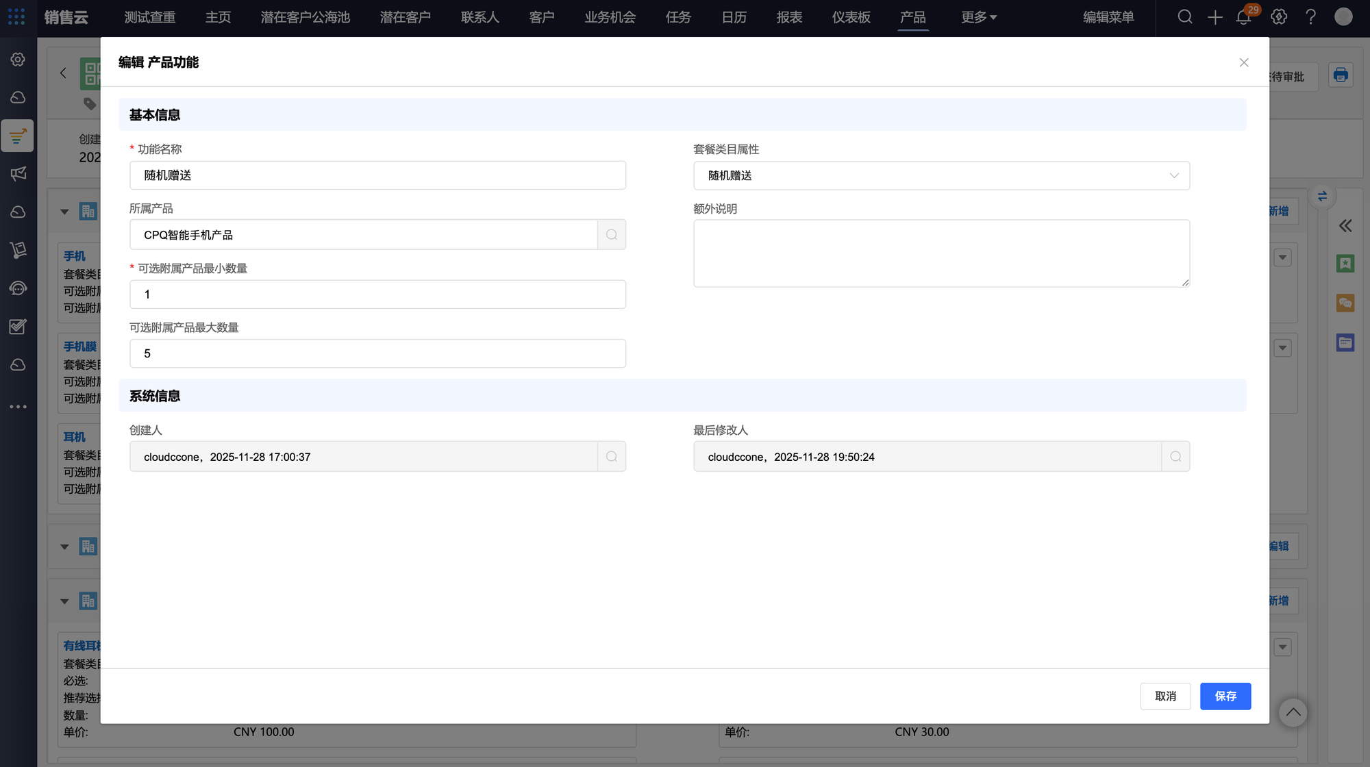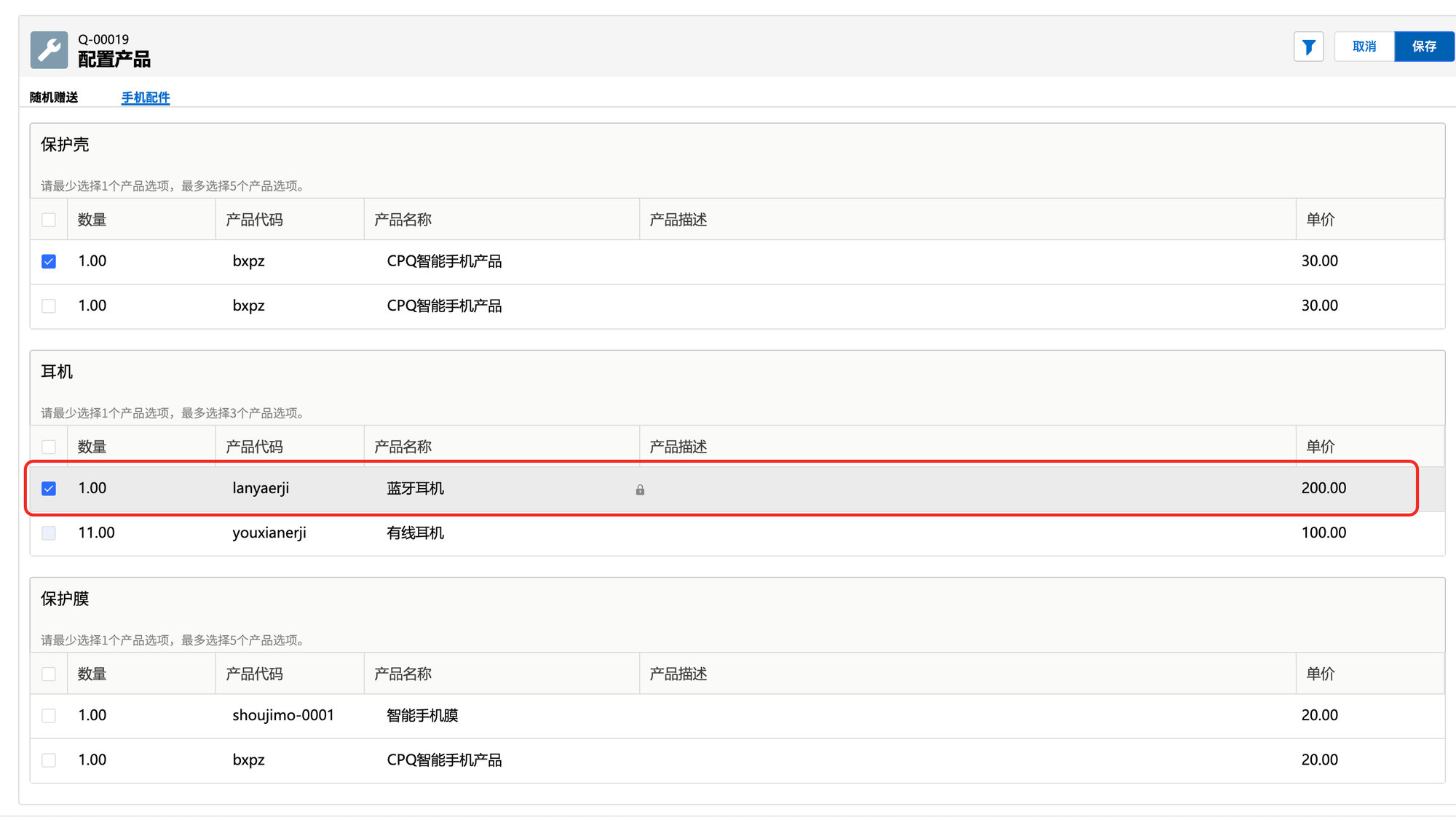 步骤 2: 在产品配置页面,配置产品下的附属产品和数量等信息。点击保存, 保存产品至报价单。