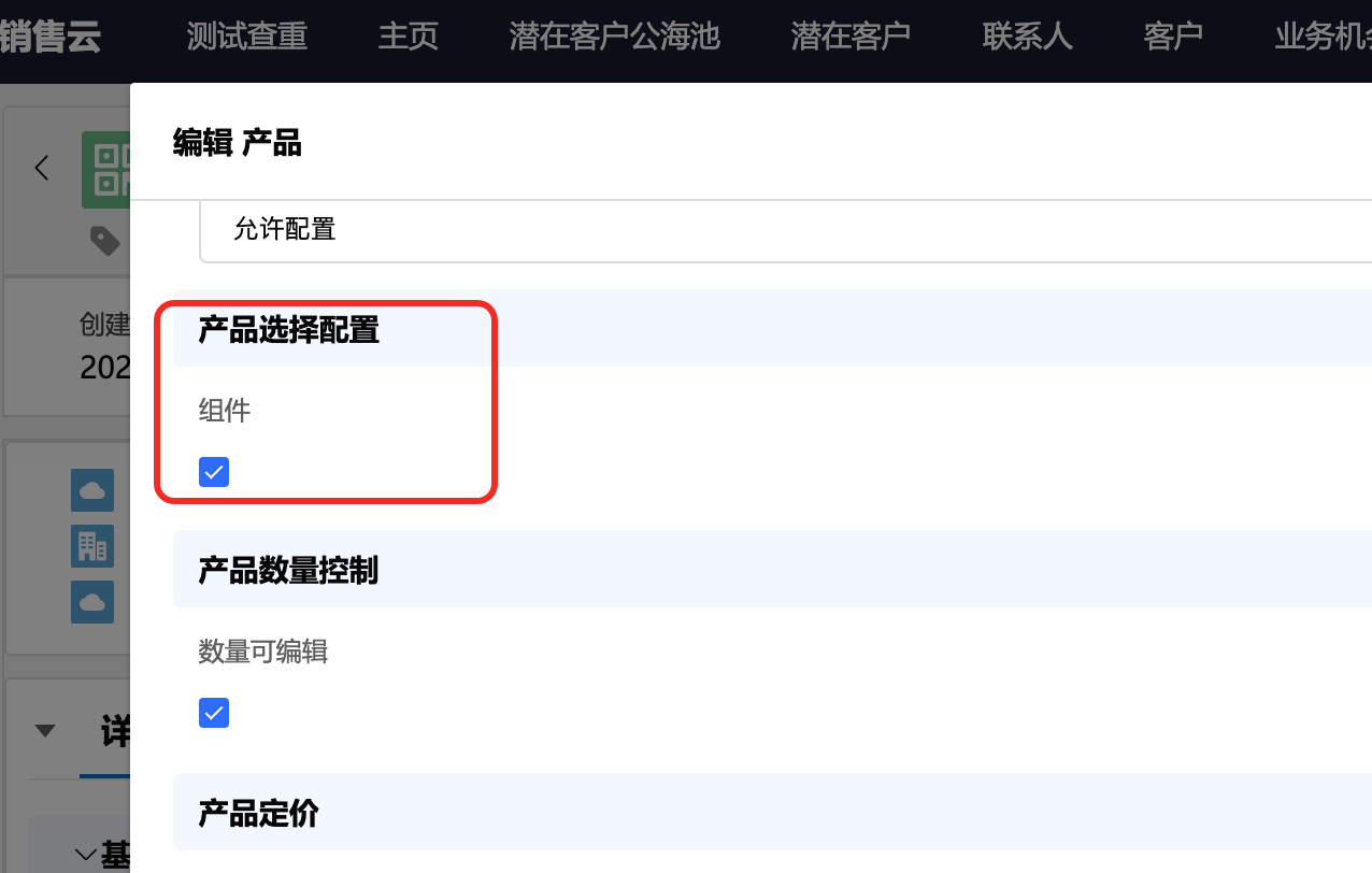 ③ 组件:若勾选该复选框,则产品被标记为组件,在报价单-选择产品页面不展示,只可作为附属产品捆绑销售。在业务机会、报价单、订单中选择产品时也会被过滤,不能作为单品出售。