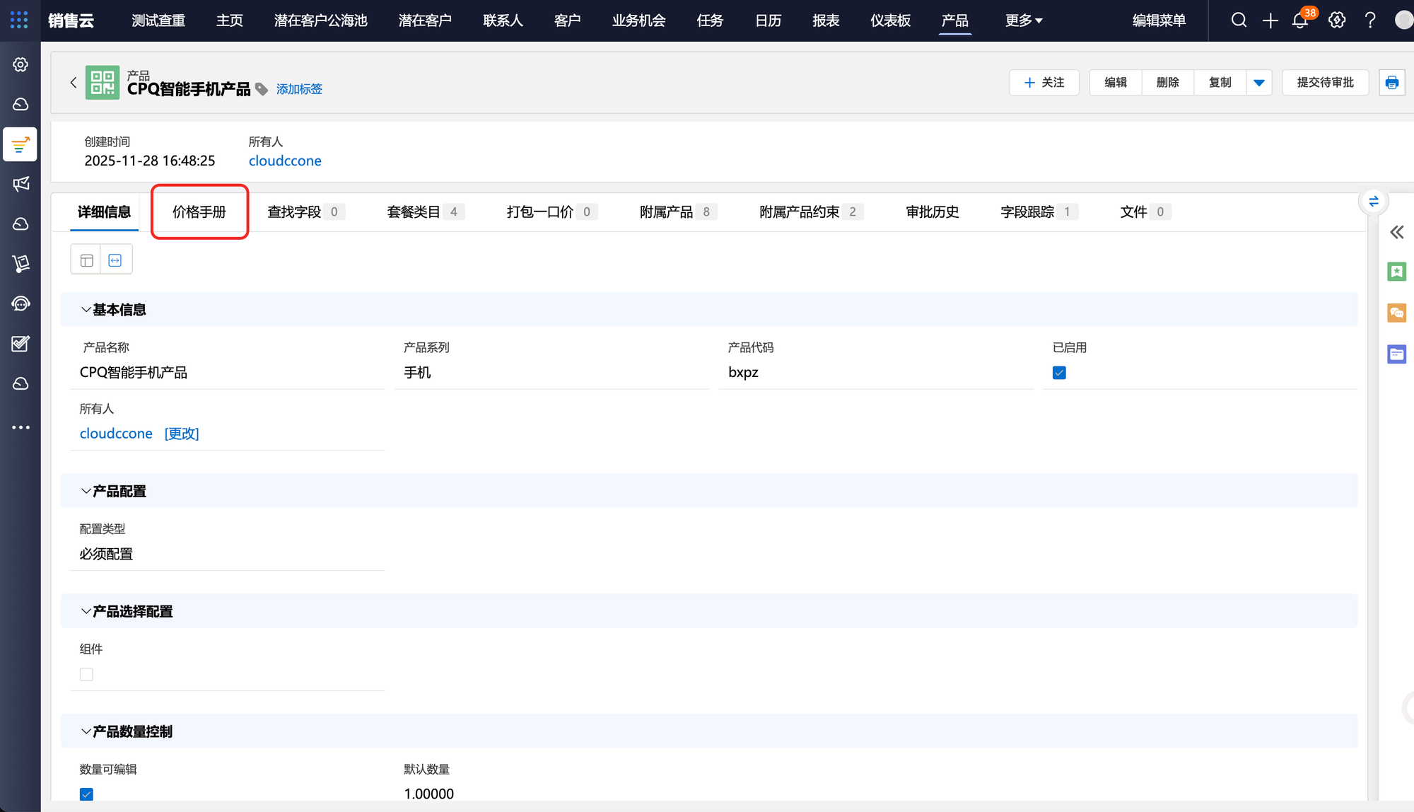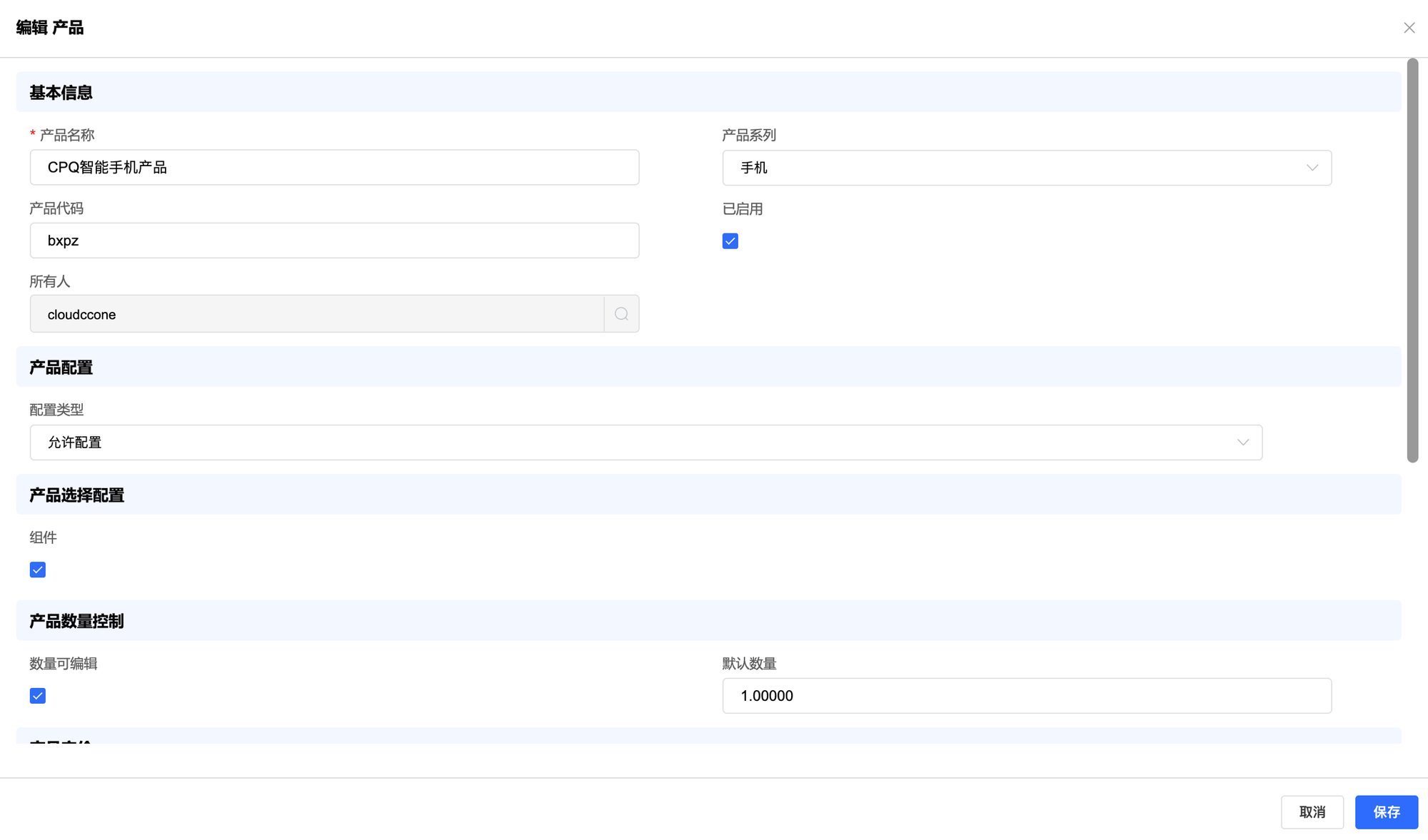 步骤 2:进入产品信息编辑页面,编辑产品基本信息、配置类型、数量、定价、 折扣等信息,其中带*号的字段为必填项。点击保存,产品创建成功。只有已启用的产品,报价时,才可以添加到报价单。