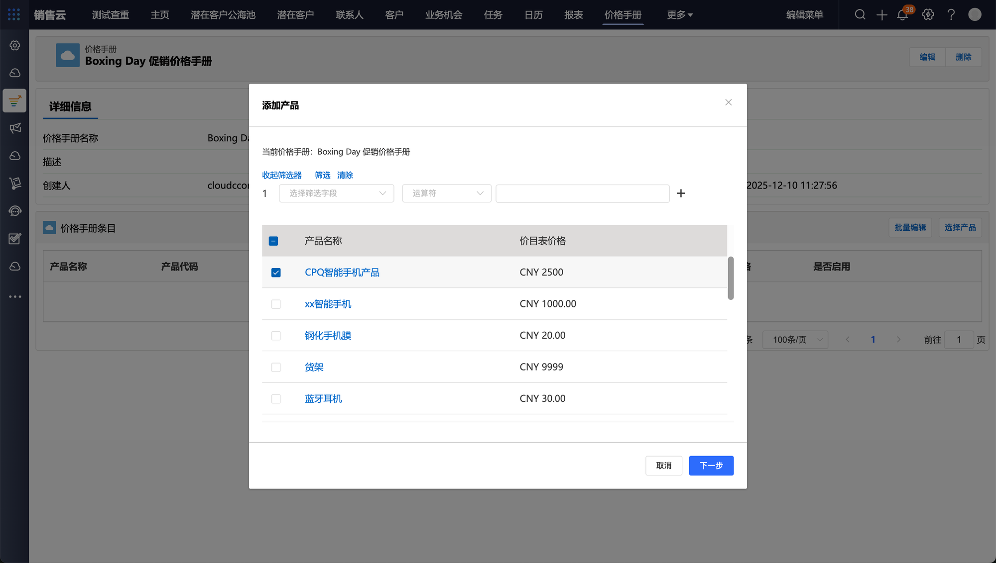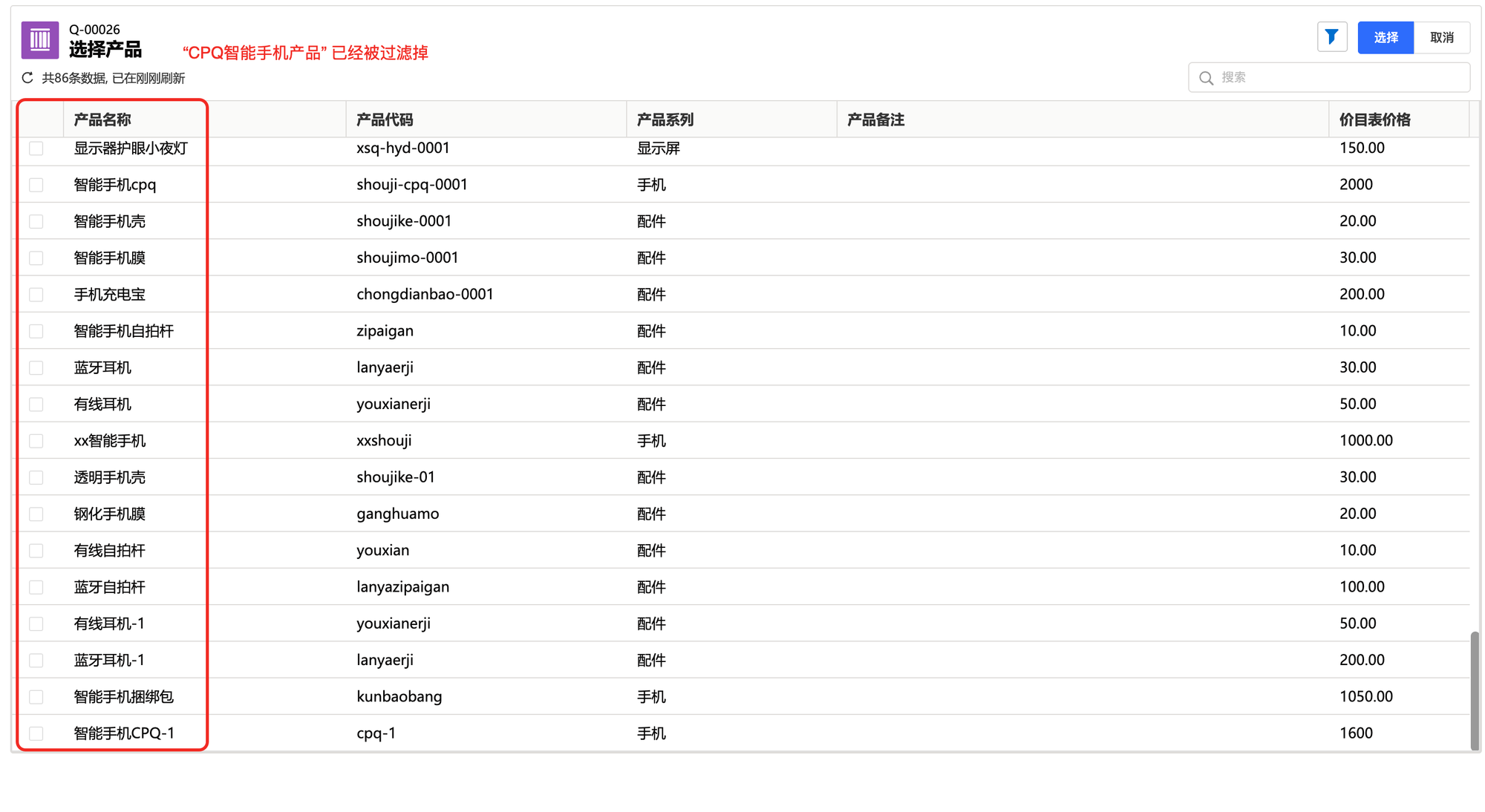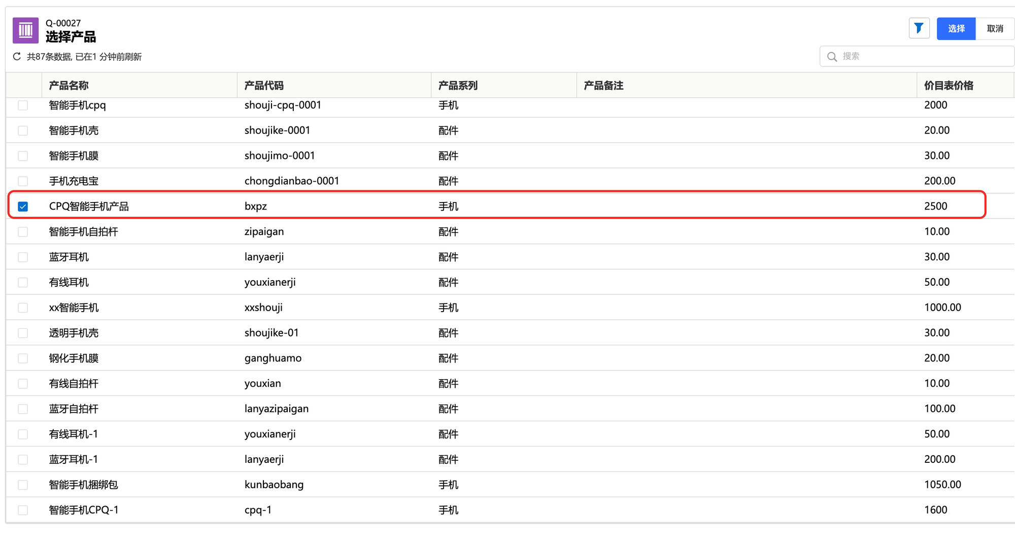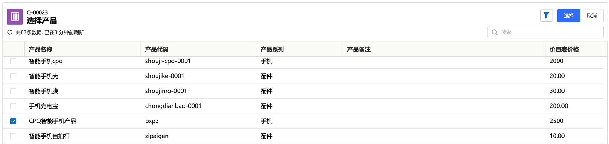 步骤 4:勾选要添加到报价单的产品,点击选择按钮,添加产品至报价单。如果产品无需配置,将跳转到报价行编辑器页面。如果产品需要配置,将跳转到配置页面。