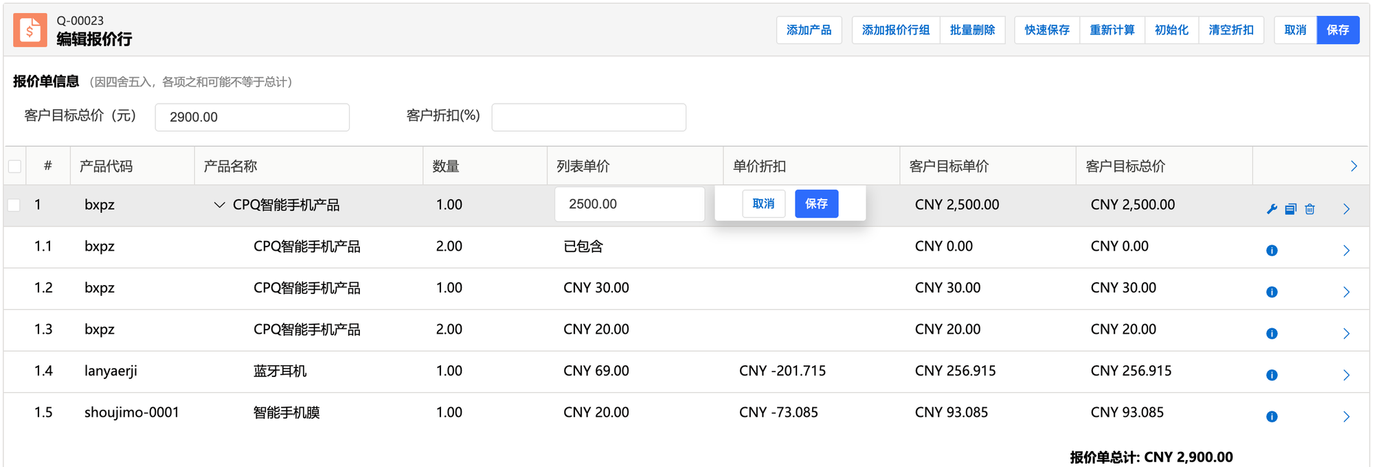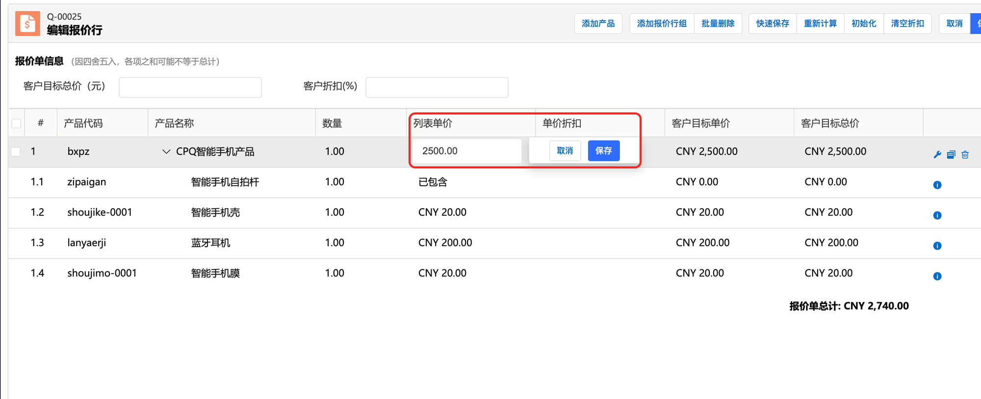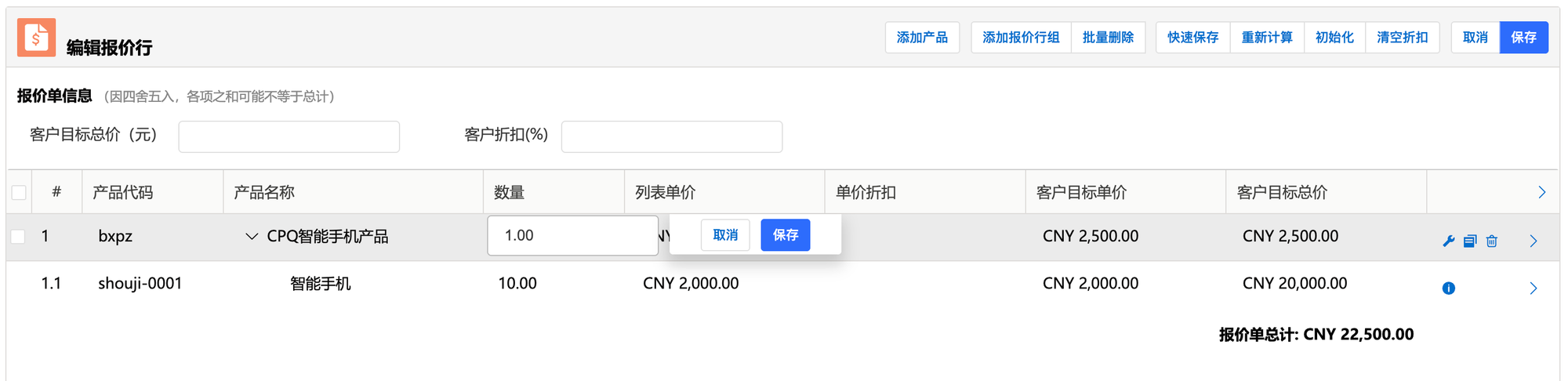 步骤 6:跳转到报价行编辑器页面,编辑产品的数量、价目表价格、额外折扣等信息,点击保存,保存报价行产品至报价单。