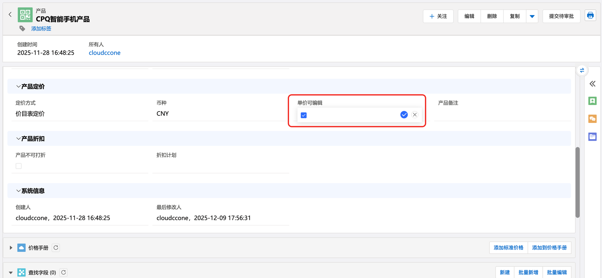 ⑦ 价格可编辑:该字段由产品下的单价可编辑字段决定。若产品单价可编辑, 那么添加到报价行时,允许销售手动修改价格;若产品单价不可编辑,则不 允许销售手动修改价格。