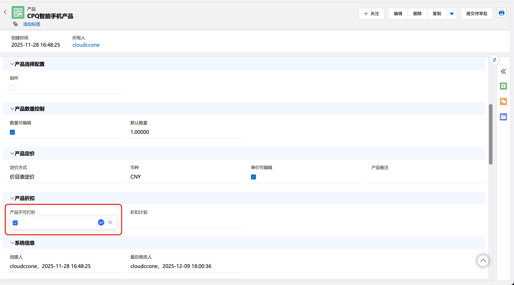 ⑧ 产品不可打折:若勾选该复选框,则该产品不管作为单品还是捆绑包中的附 属产品出售,在报价单中均不可打折,销售不可手动编辑报价行的额外折扣。