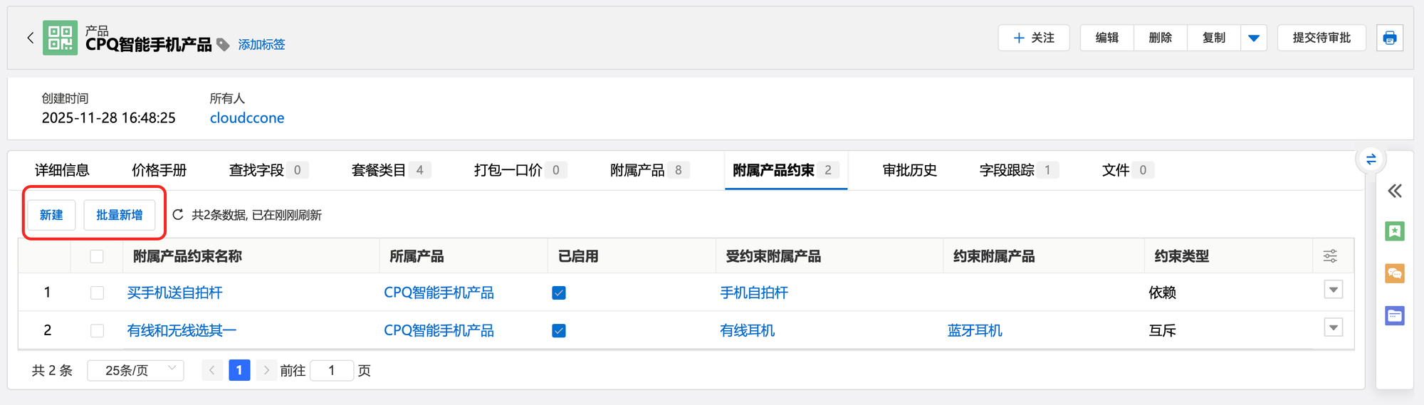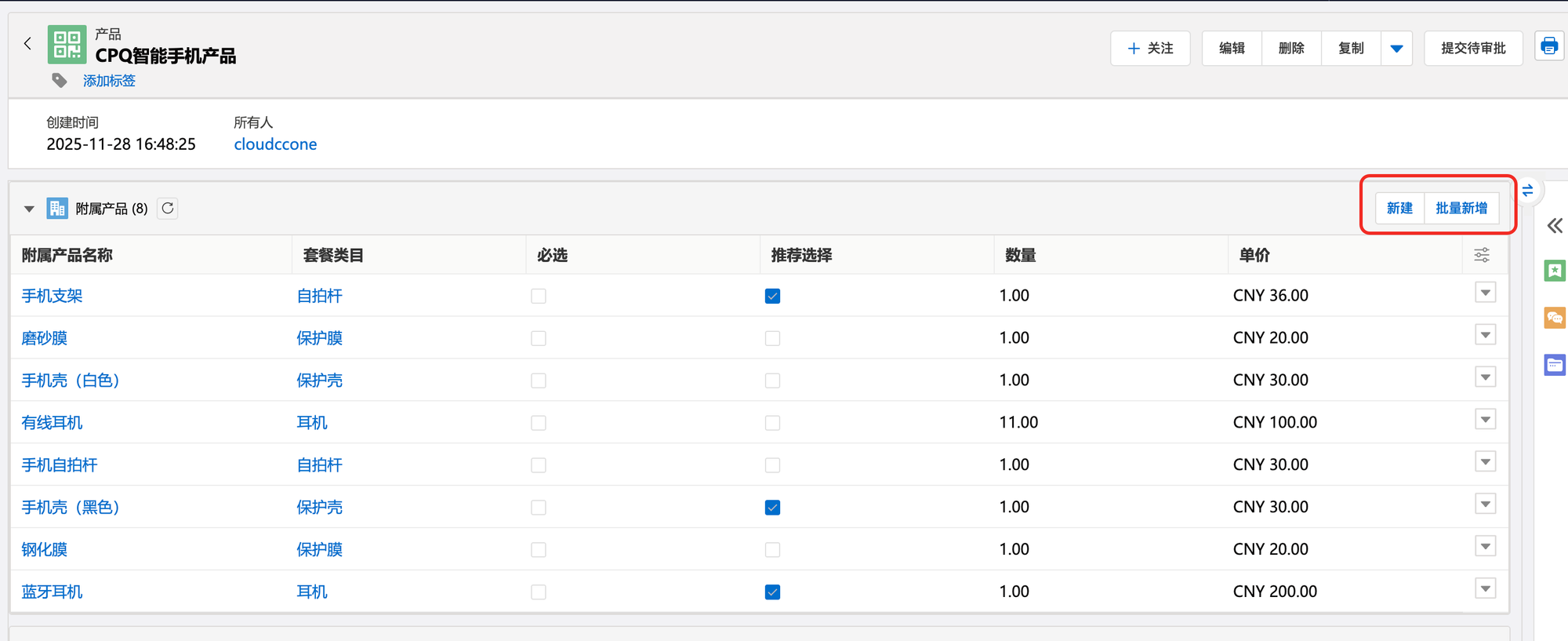 步骤 2:在该产品相关列表,找到附属产品,点击新建。