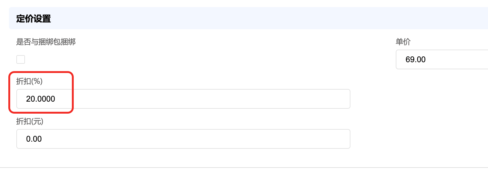 ⑨ 特价:产品的特价,将等于列表单价的值。若附属产品有单独折扣,即附属产品的折扣(%)或折扣(元)有值时,该字段将自动计算附属产品折扣后的价格。
