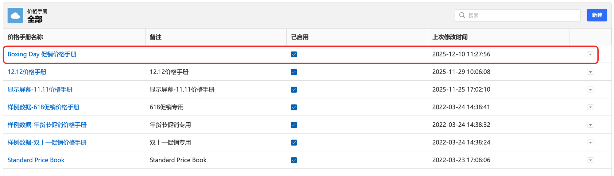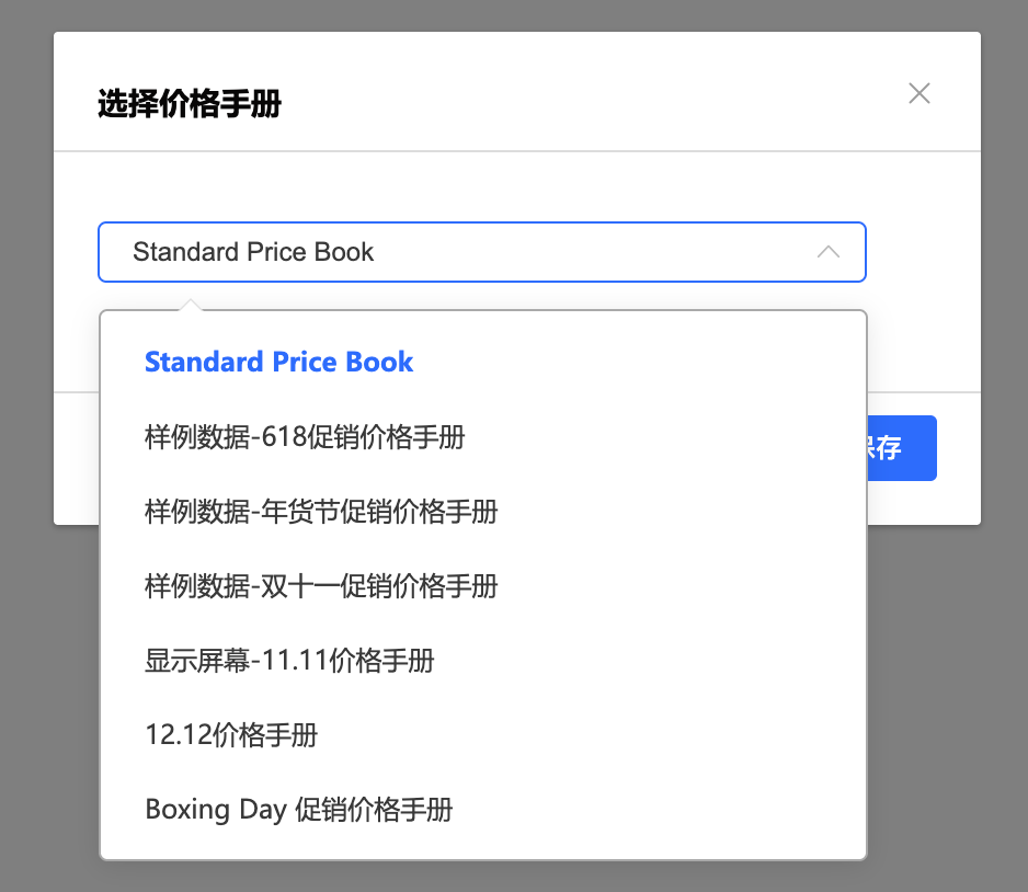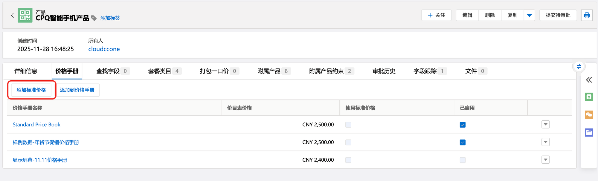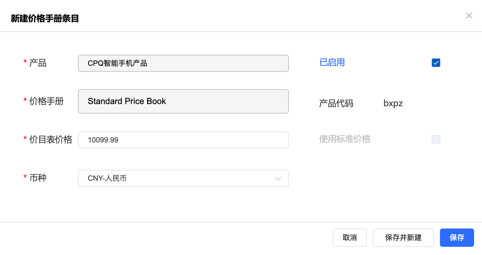 标准价格手册价格:通常,每款产品都会有一个标准定价,我们称之为标准价格手册价格。系统默认会生成 1 个标准价格手册,产品的标准定价,将被保存 到标准价格手册中。
