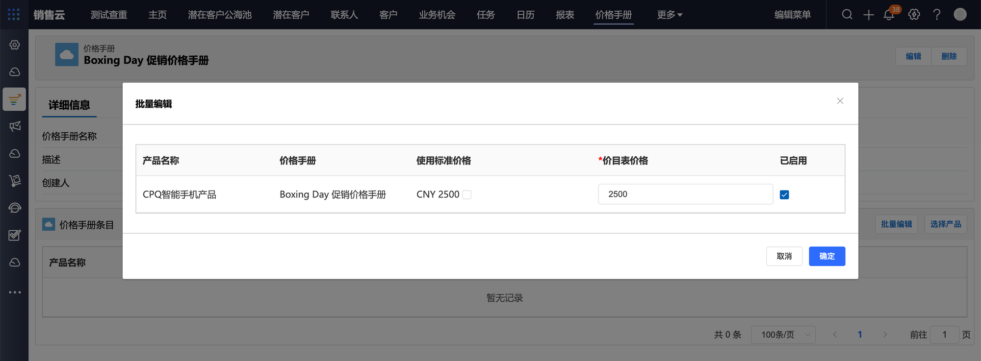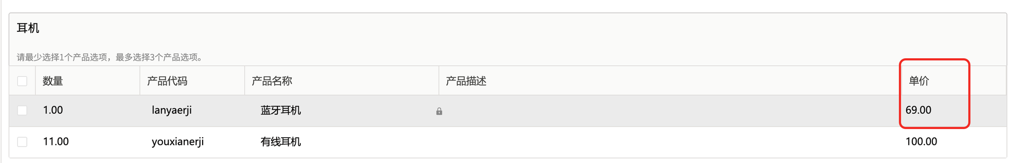 ⑦ 单价可编辑:复选框不勾选时,产品被添加到报价行后,价目表为只读,不可编辑。勾选之后价目表价格才可以编辑。