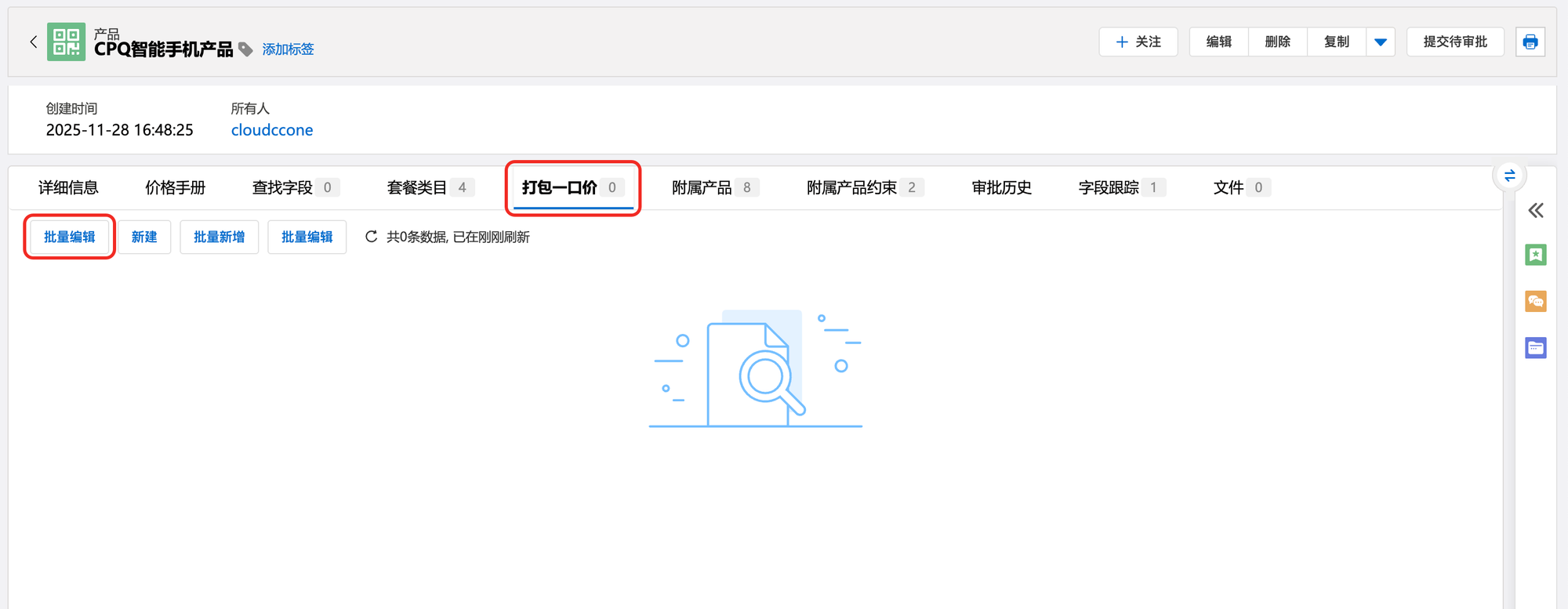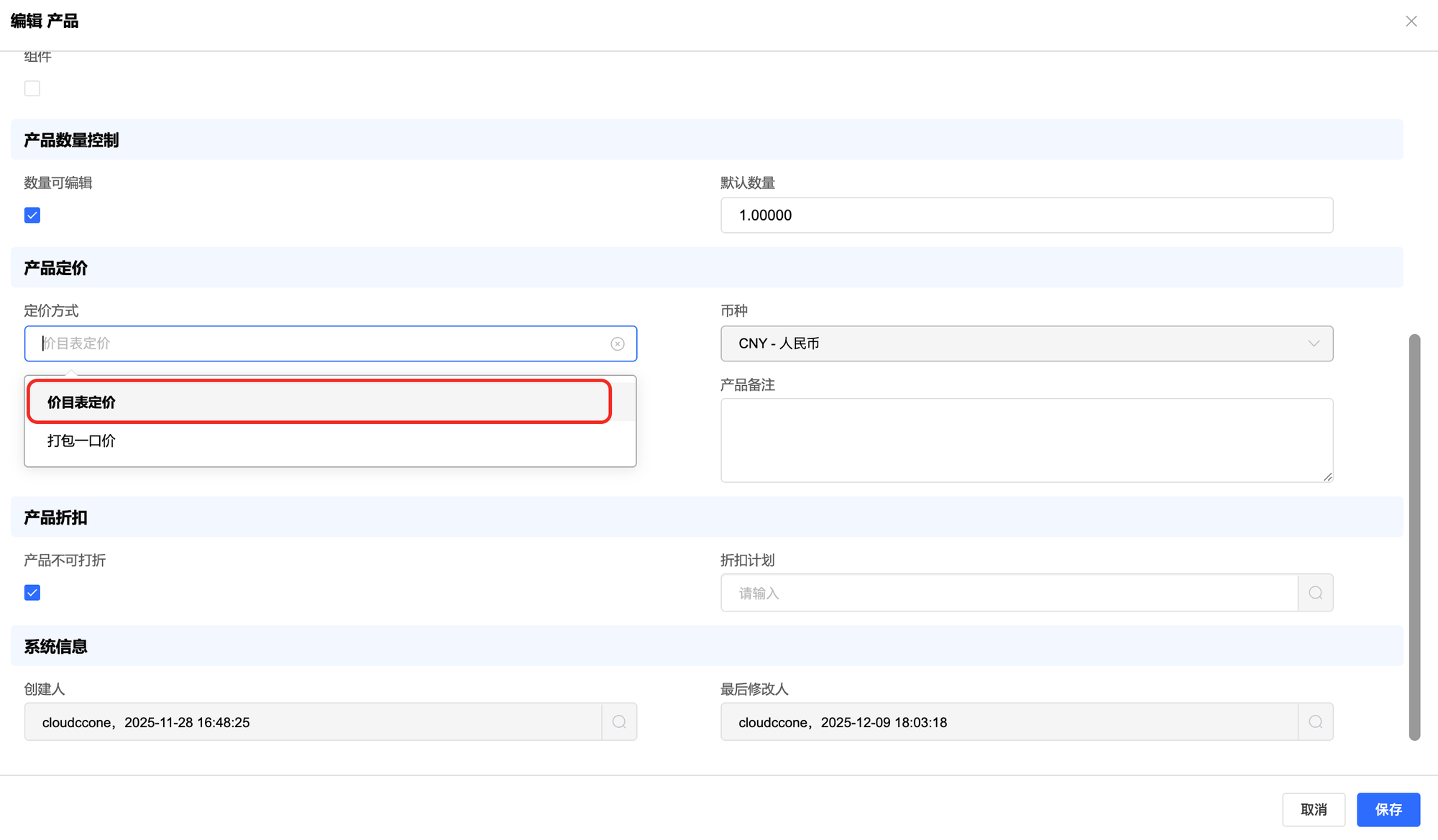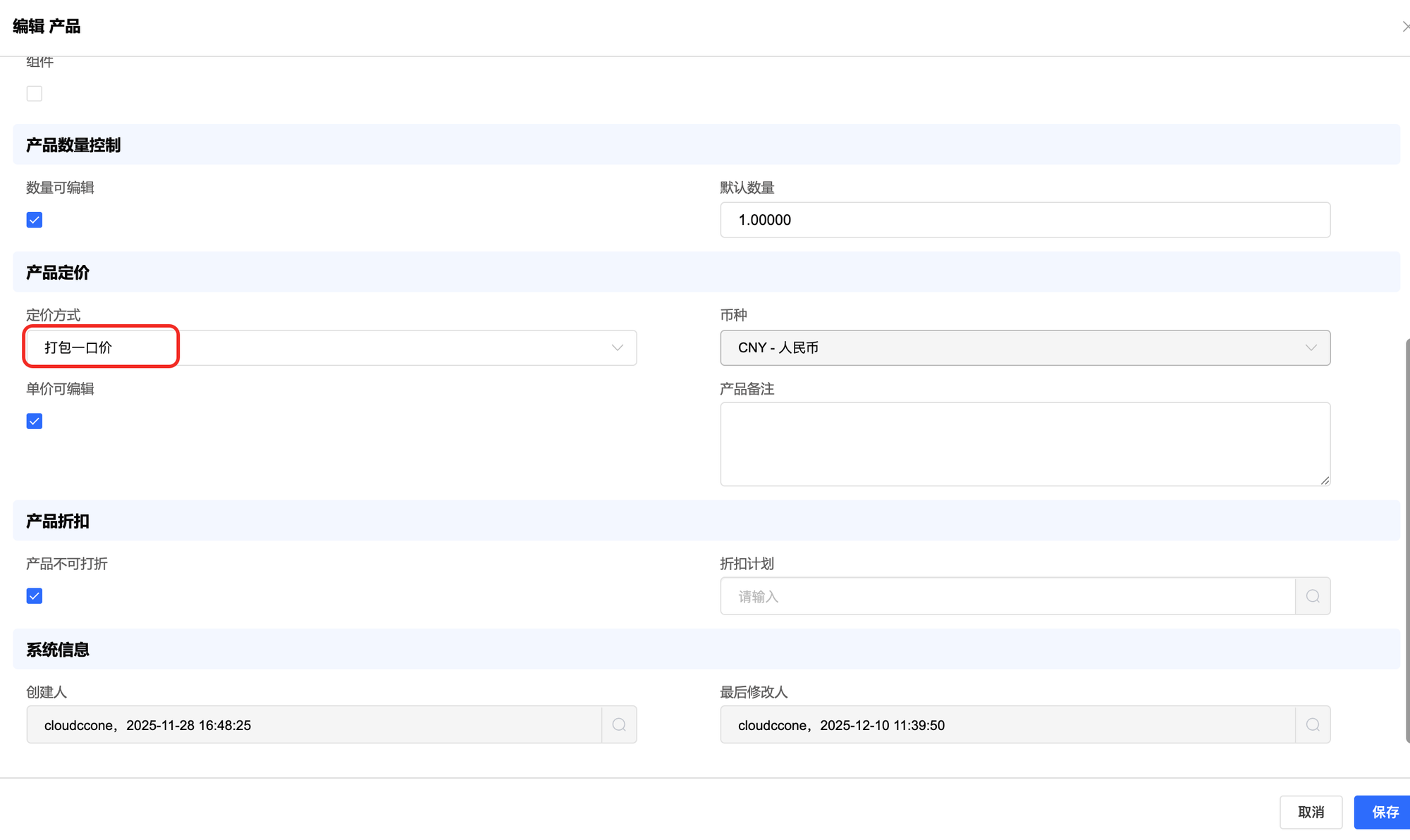 💡 【备注】 当产品定价方式为打包一口价时,默认产品价格表价格不可编辑,该价格根据产品的数量和打包一口价数量范围计算得出。