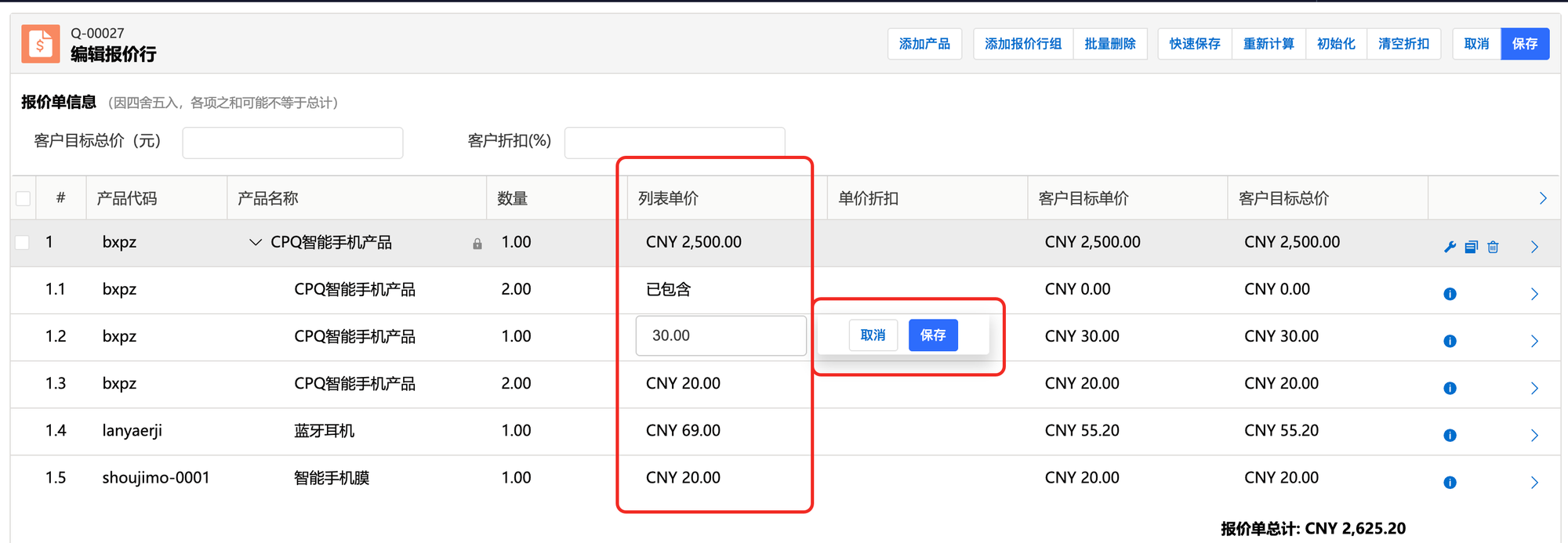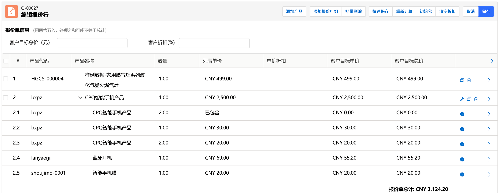 ③ 客户目标价格:输入与客户协商好的该报价行组的总金额,该报价行组的总计将以该值为准。