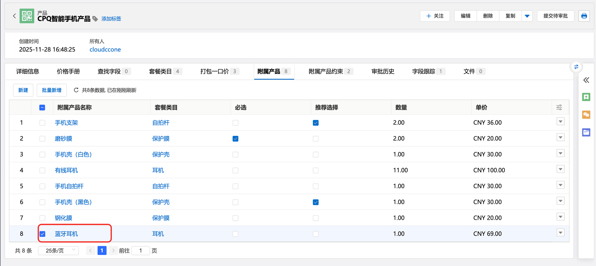 在上例中,手机可以和钢化膜、磨砂膜等 8 种产品进行捆绑销售,这时需要 把这 8 种产品均添加为手机的附属产品。