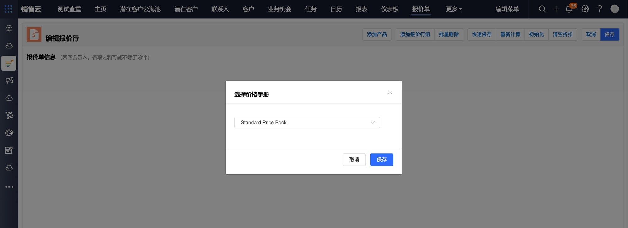步骤 2:点击下拉按钮,可查看目前已启用的所有价格手册名称。选择该报价单适用的价格手册,点击保存,跳转到报价行编辑器页面。