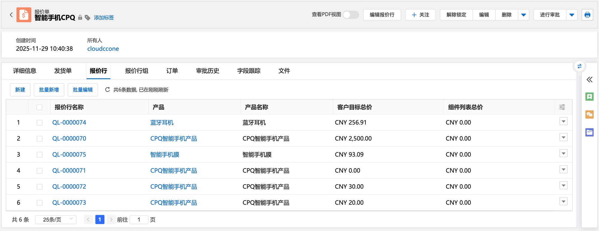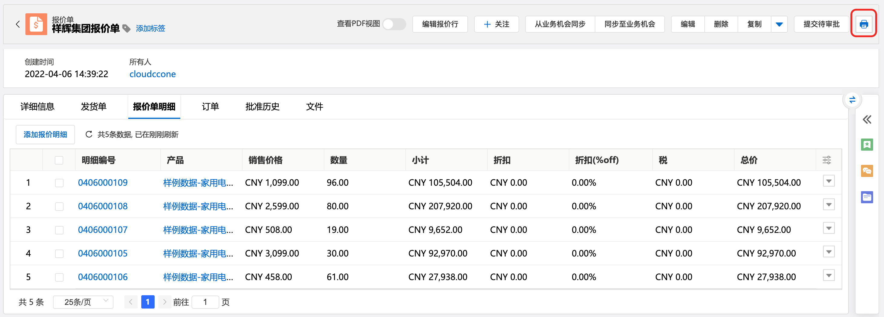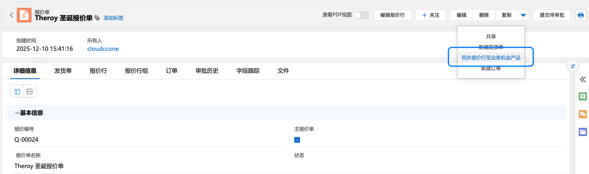 步骤 2:点击报价单详情页右上角同步报价行至业务机会按钮,报价单的报价行会同步至业务机会产品。