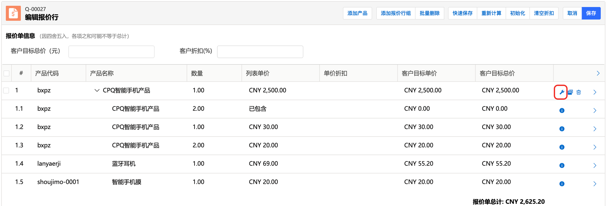 步骤 1:点击报价行的“🔧”按钮 ,进入产品配置页面。