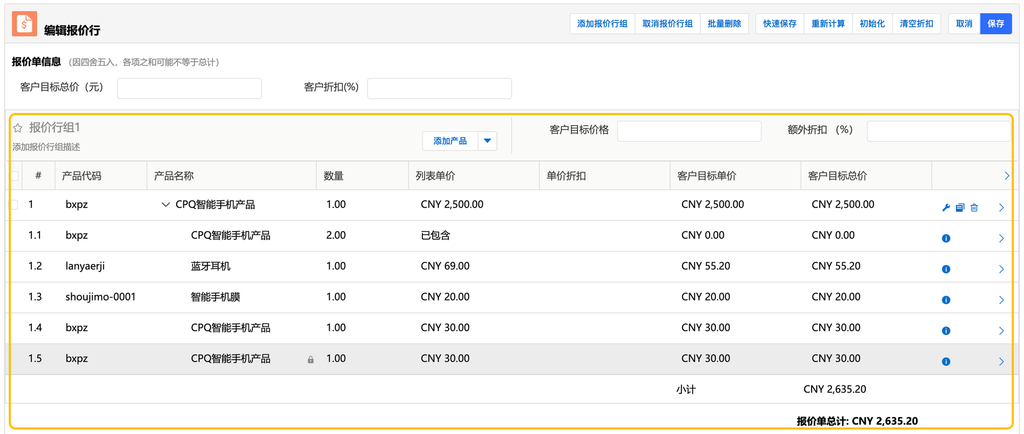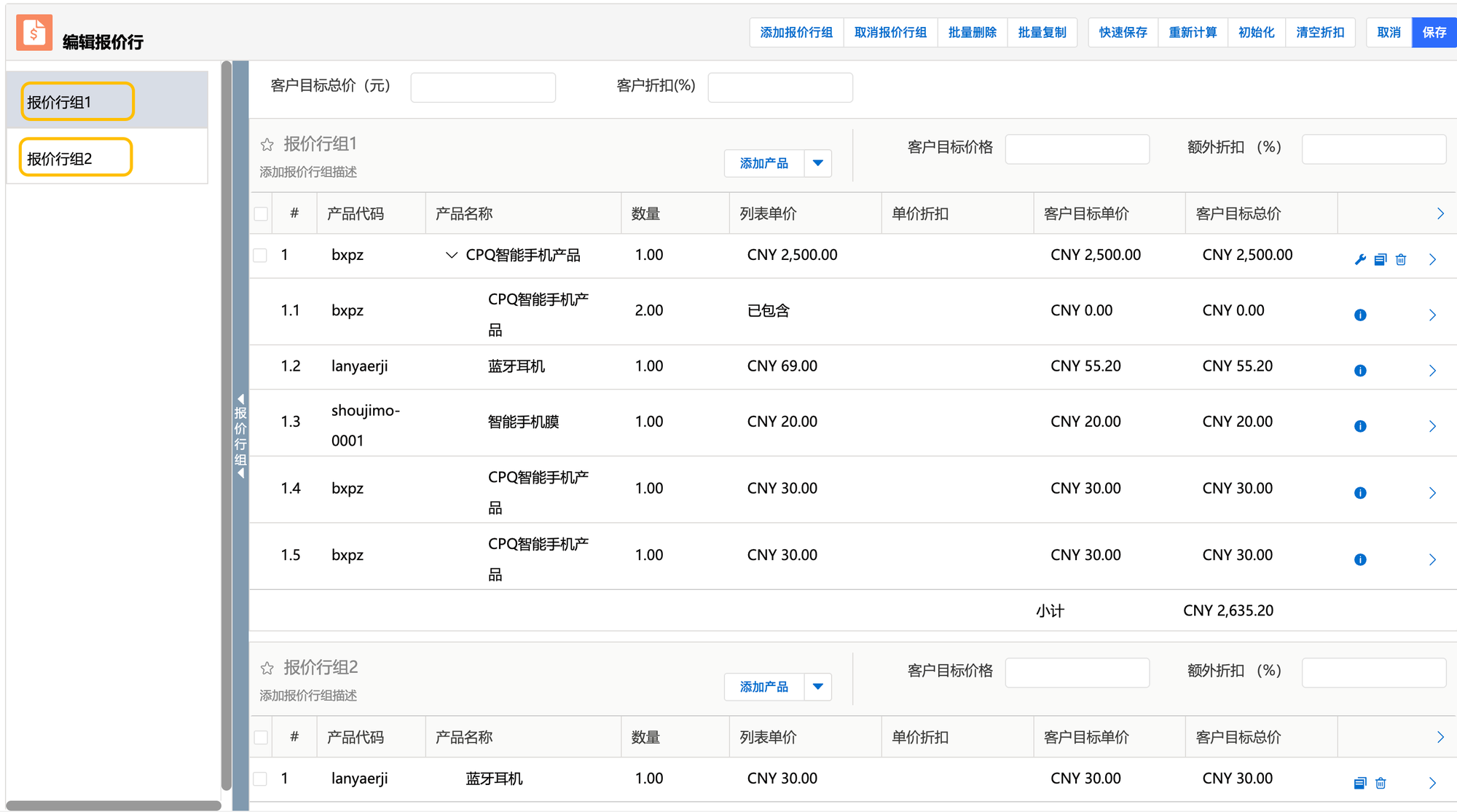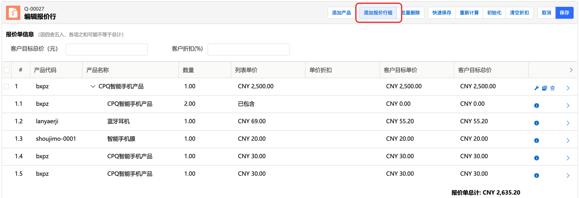 保存产品至报价单后,如果需要对某些产品进行分类或设置统一折扣,可以将某些产品添加到同 1 个报价行组中。