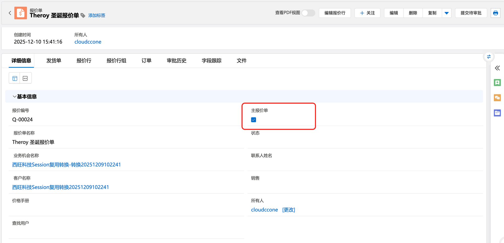 步骤 1:勾选报价单的主报价单复选框,点击保存。