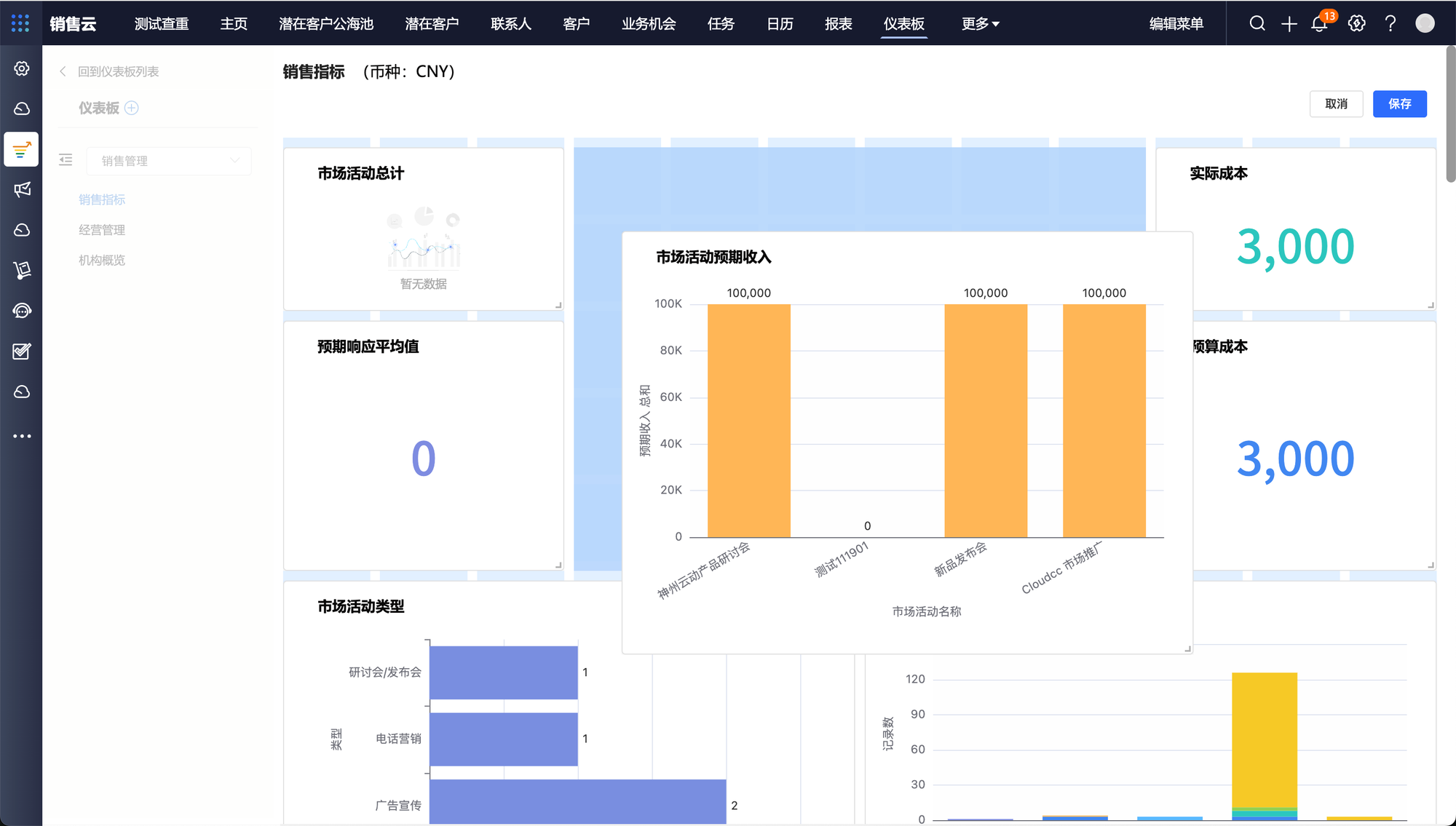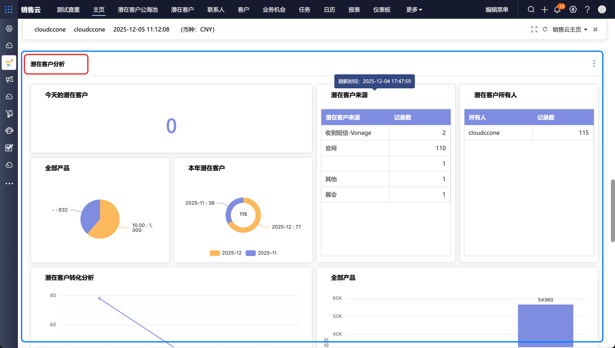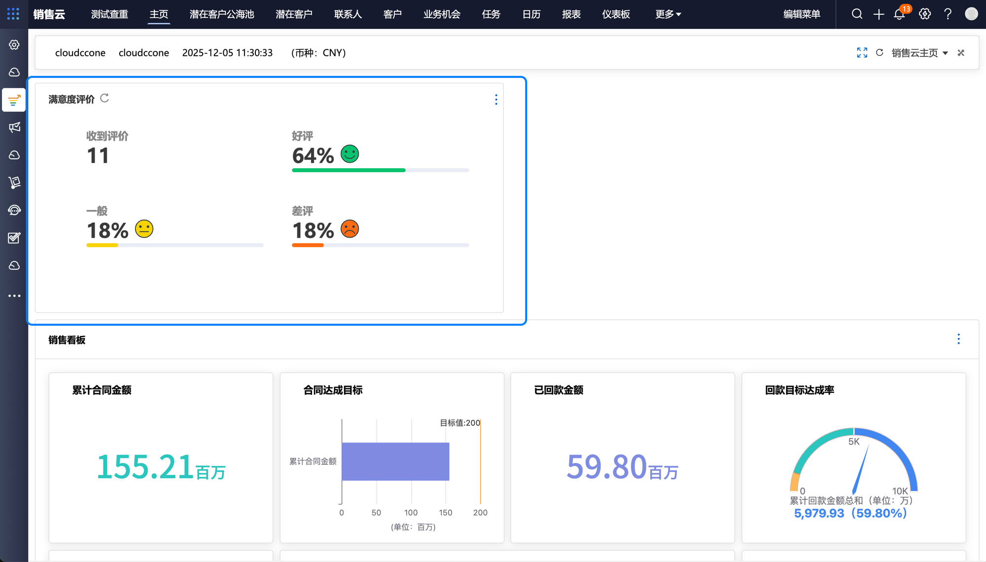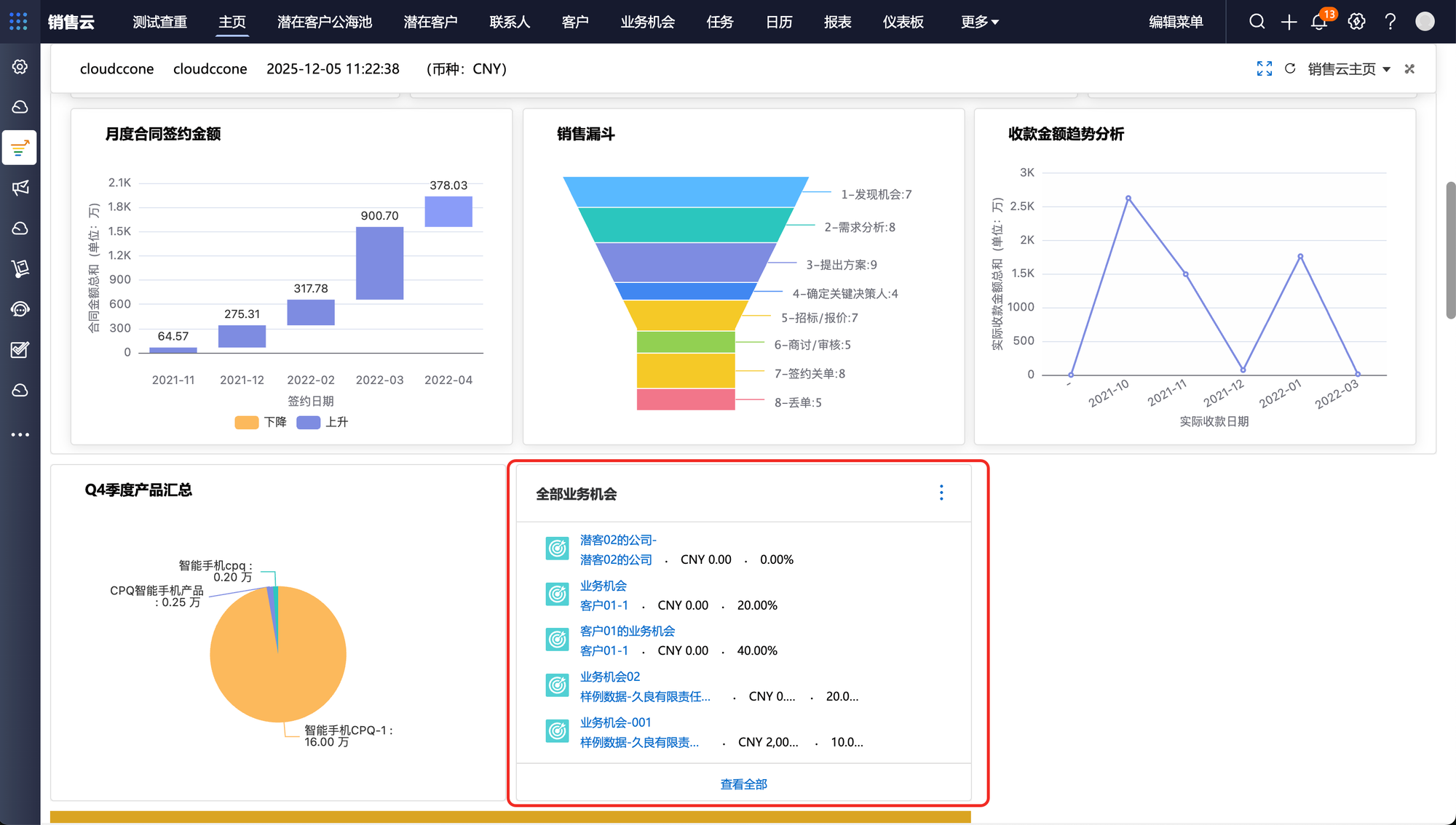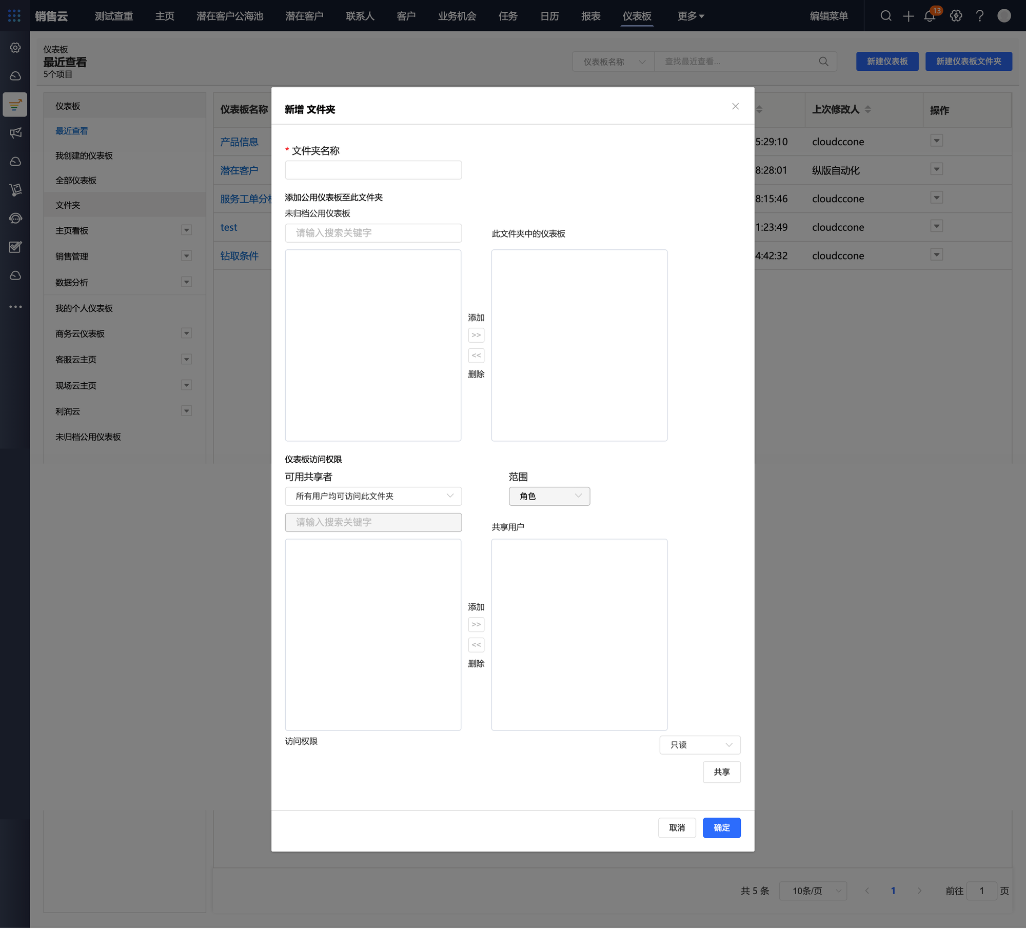 登录 CloudCC 前台首页,在菜单中点击 “仪表板”,进入仪表板列表页面,即可查看所有有权查看的仪表板文件夹及仪表板。