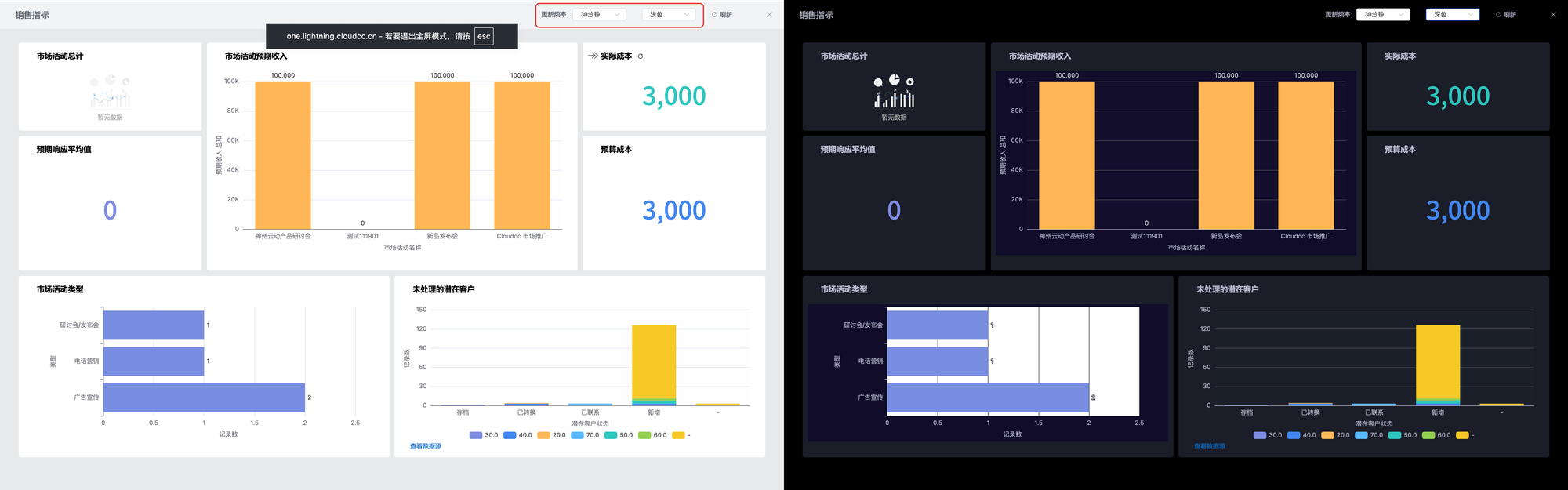 对单一仪表板点击右上角放大按钮,可以大屏展示整张仪表板。仪表板会按照设定的刷新时间自动刷新,大屏有两种风格,深色和浅色。