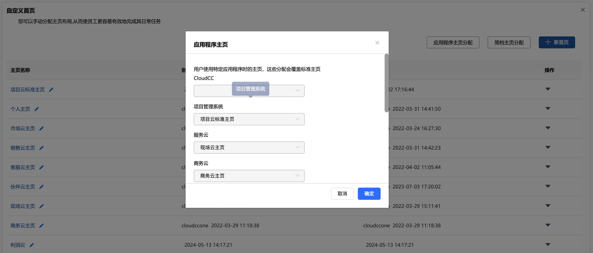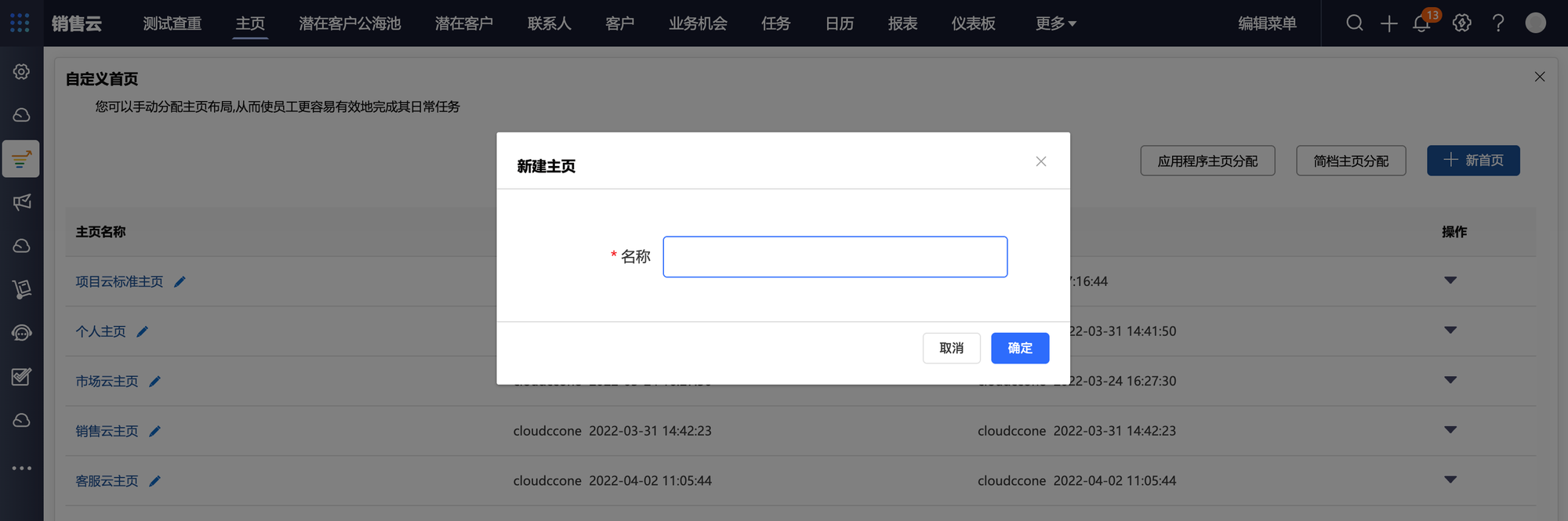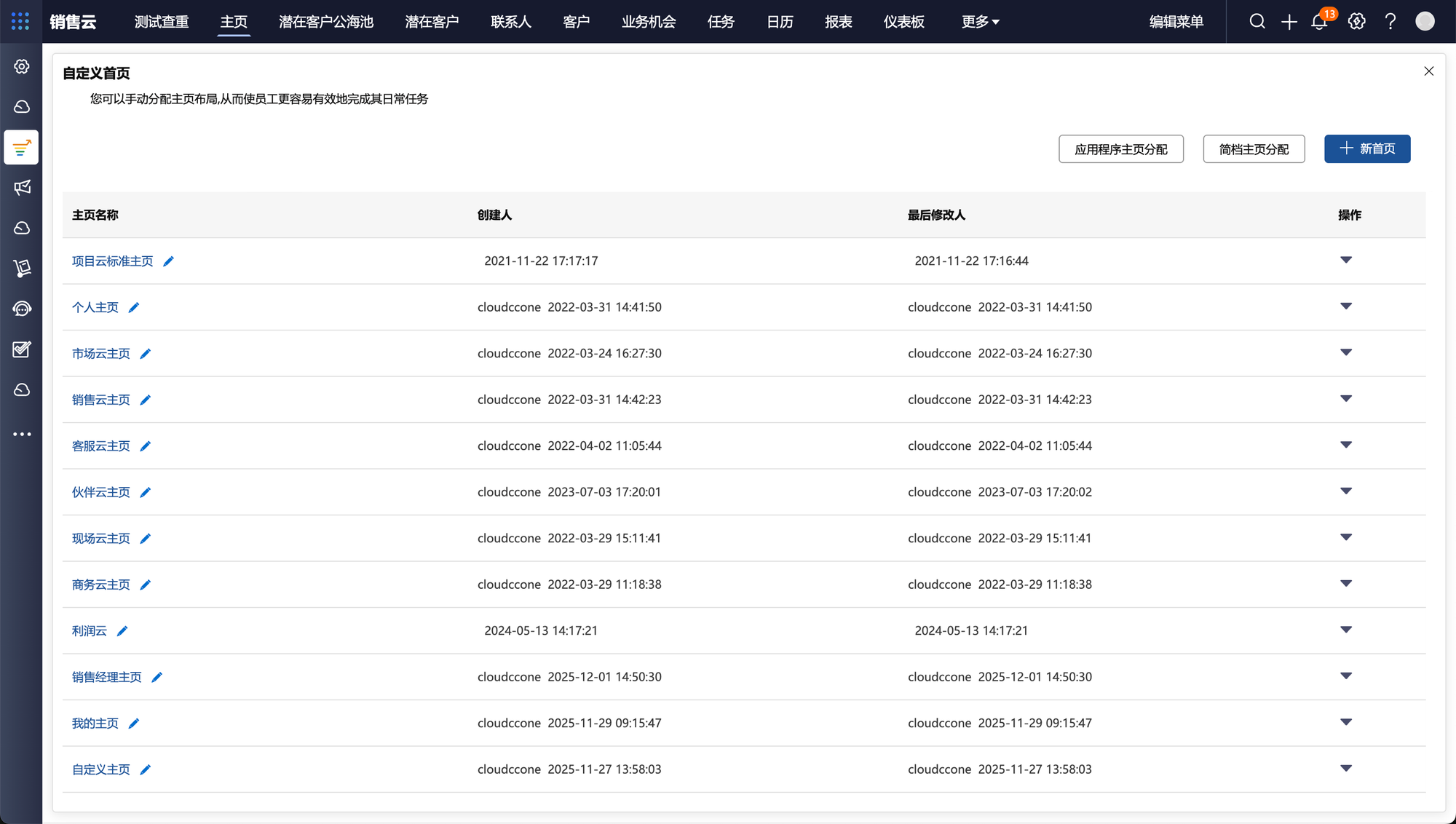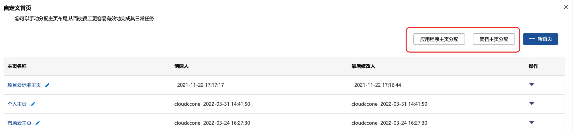 管理员点击自定义主页可以进入主页管理页面,在此页面,管理员可以新建、编辑、删除、分配主页。