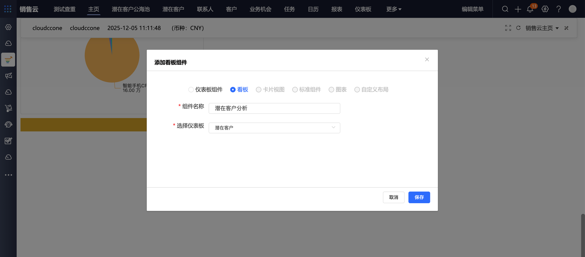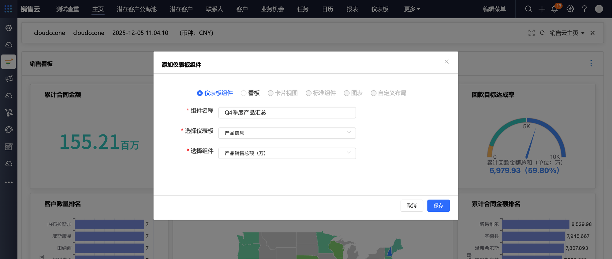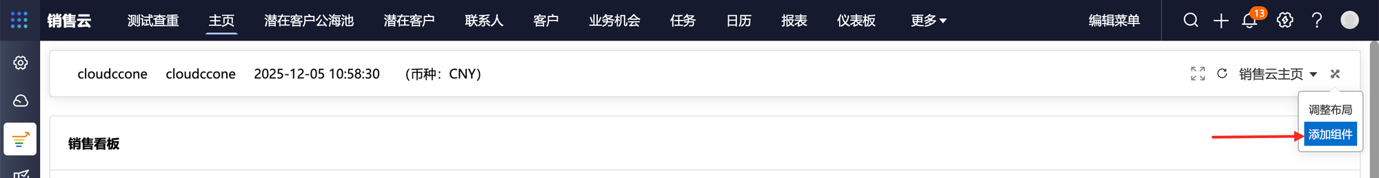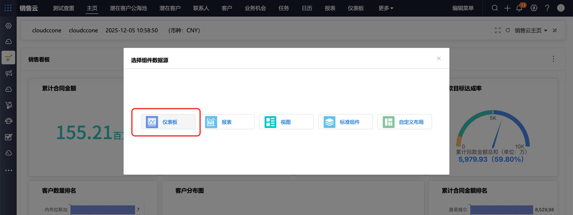 ①在首页右上角点击“添加组件”按钮,可以添加 5 种类型组件,其中一种是“仪表板组件”。