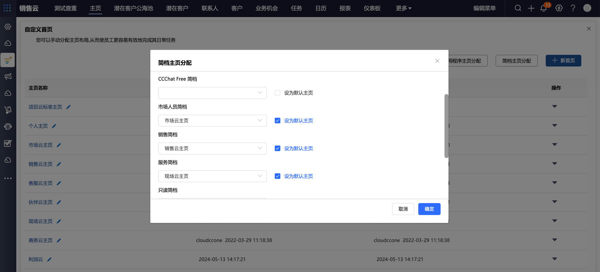 ②简档主页分配,正常用户可以在标准主页和个人主页切换,但当管理员给用户对应简档分配了主页后,正常用户就可以在标准主页、个人主页和简档主页之间切换。且管理员可以设置简档主页为默认主页,用户进入主页时,默认会看到自己被分配的简档主页。