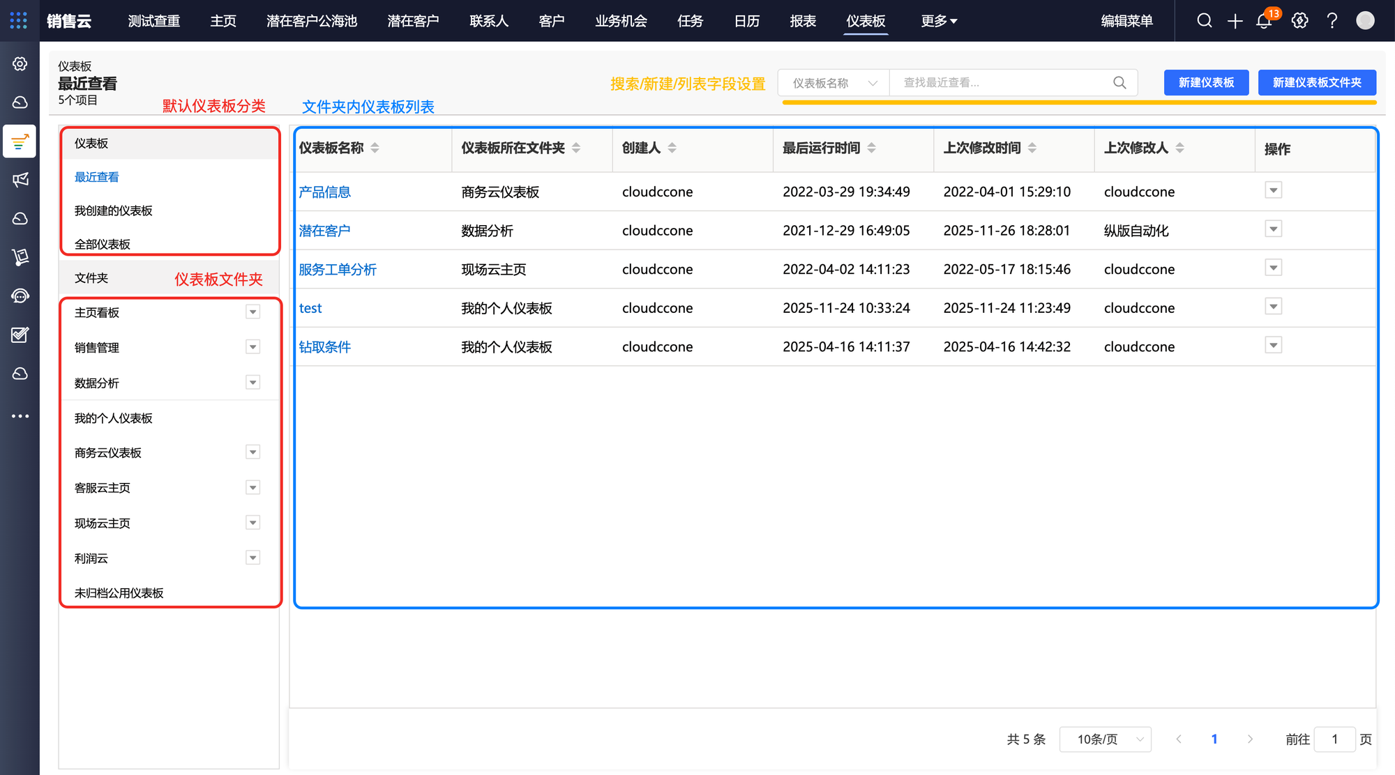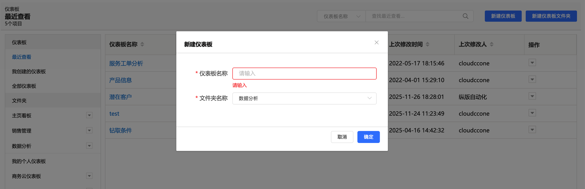 | 搜索/新建/列表字段设置 | 搜索:可根据仪表板名称或仪表板文件夹名称进行搜索 |