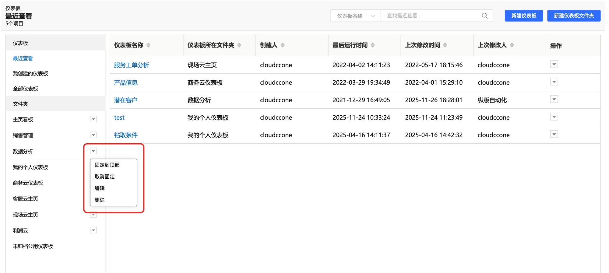 | 仪表板文件夹 | 仪表板文件夹包含登录用户所有可见权限的文件夹,分为置顶文件夹和普通文件夹 |