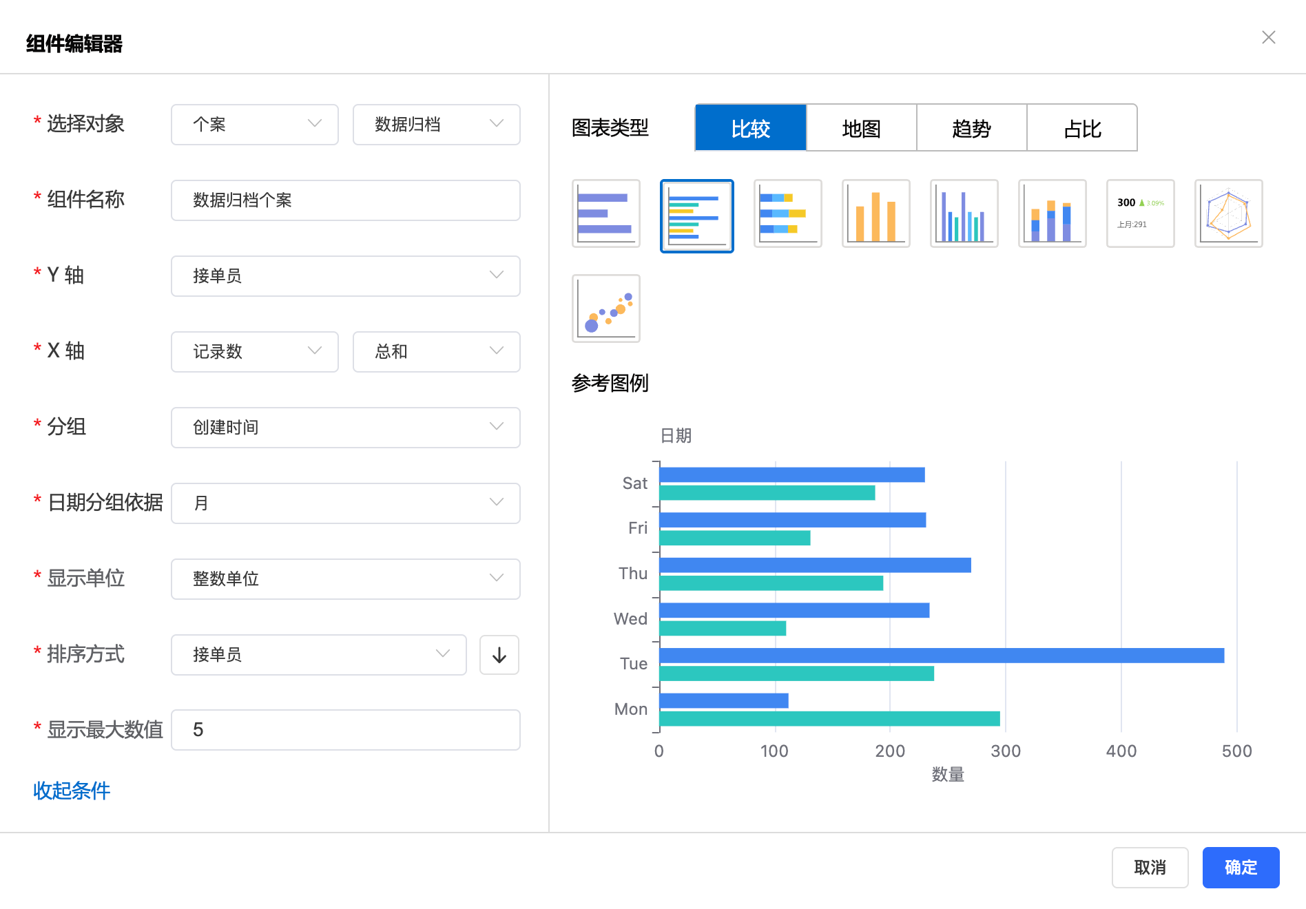 | 格式化信息 | 显示单位:统计数据按什么数字单位显示,整数单位代表无单位 排序方式:按统计值还是分组值排序,升序还是降序 显示最大数量:最多展示多少个分组 数据标签:控制显示值还是百分比 |
