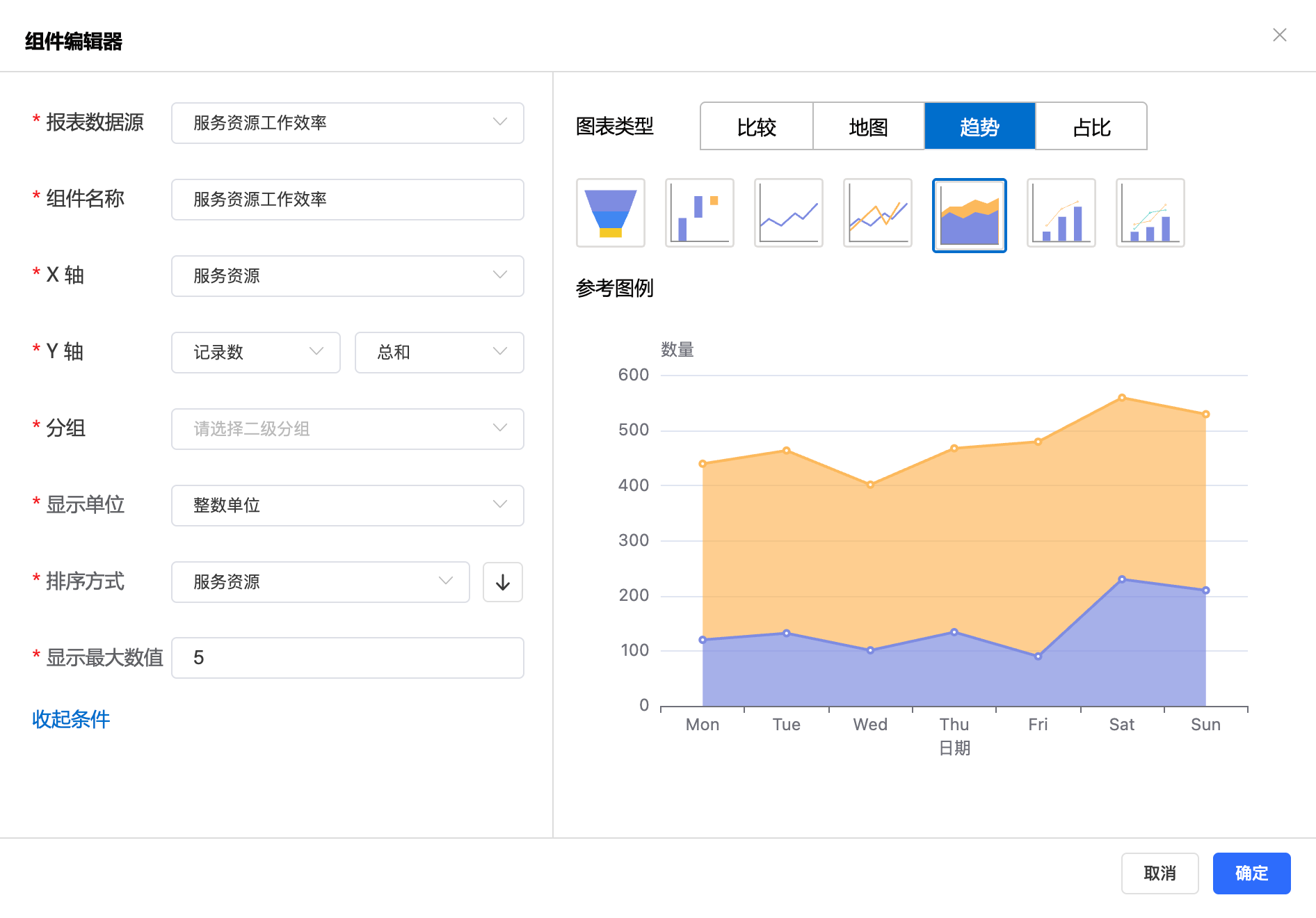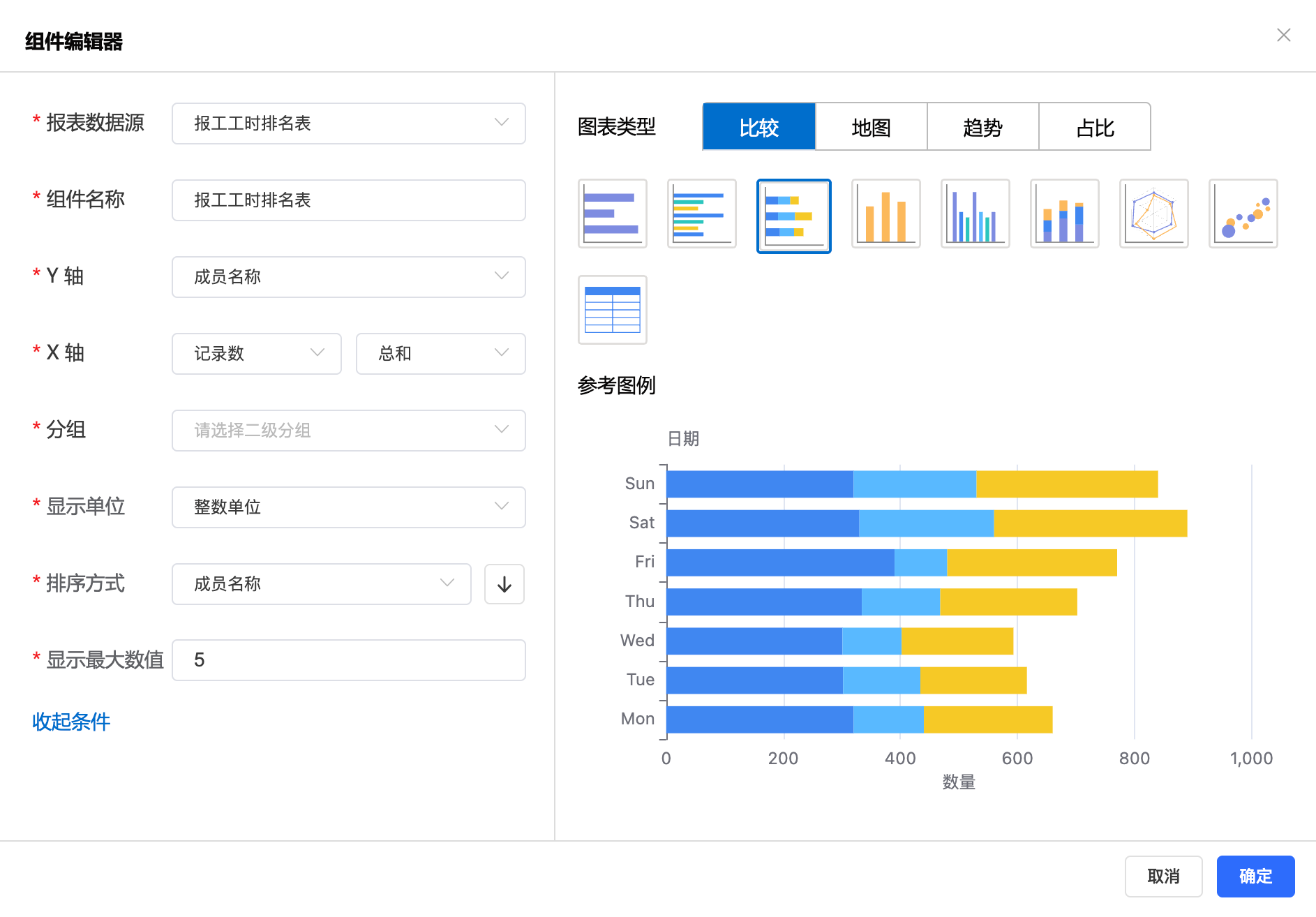 | 格式化信息 | 显示单位:统计数据按什么数字单位显示,整数单位代表无单位 排序方式:按统计值还是分组值排序,升序还是降序 显示最大数量:最多展示多少个分组 |