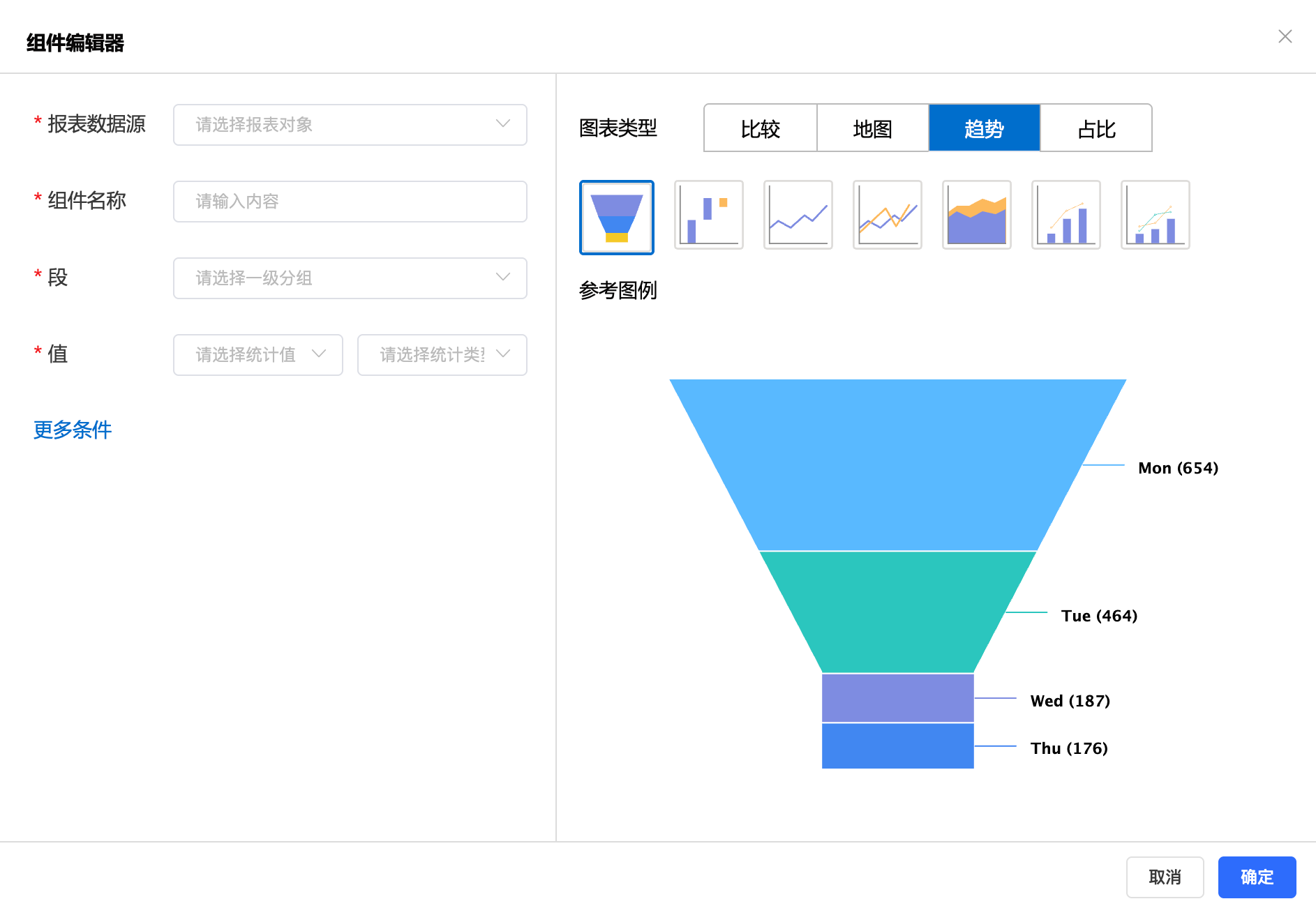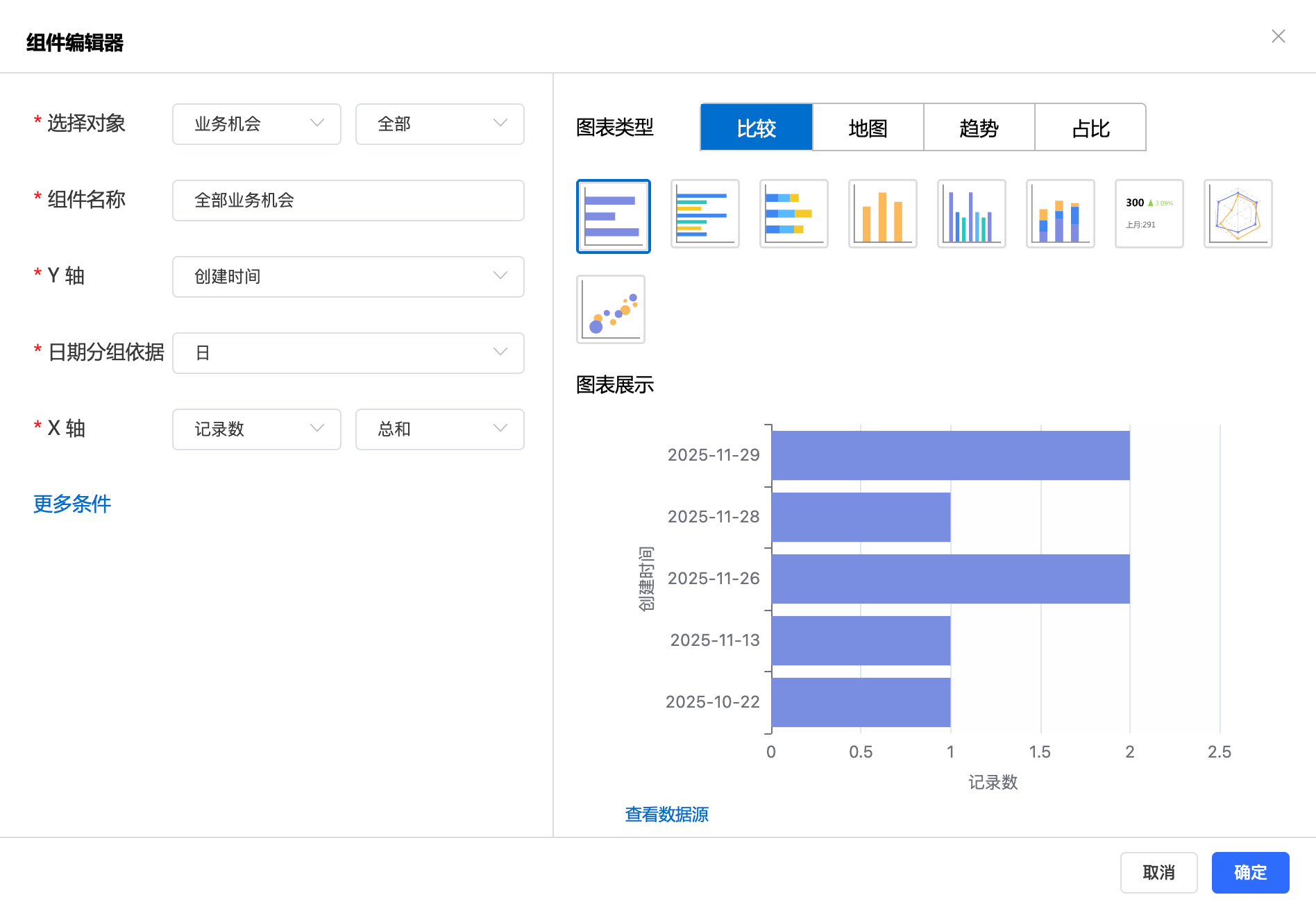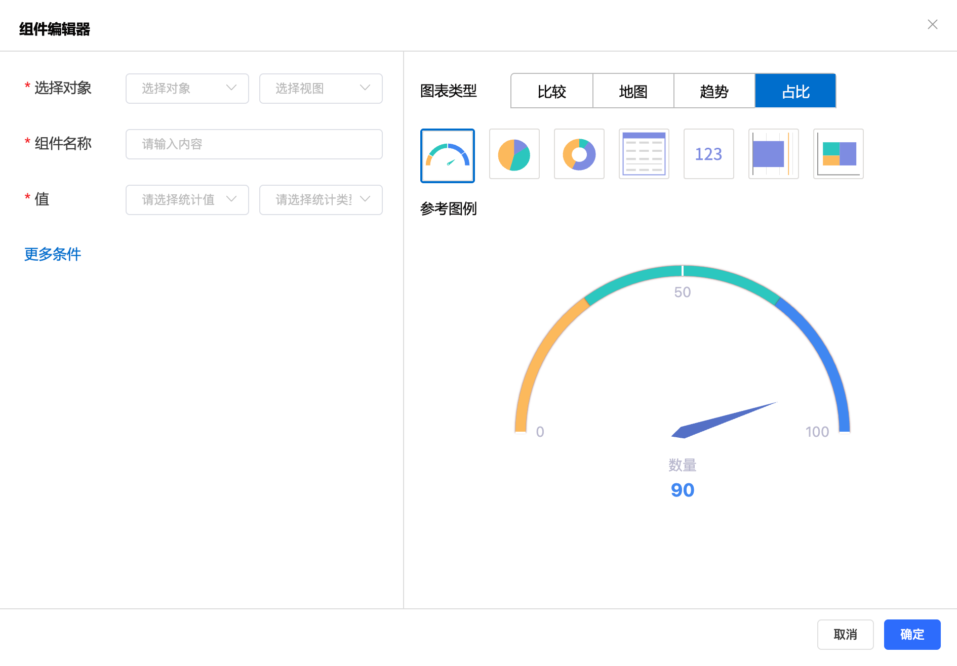 | 数据源 | 报表:选择具体的报表 列表视图:选择具体的对象后选择该对象下具体的视图 |