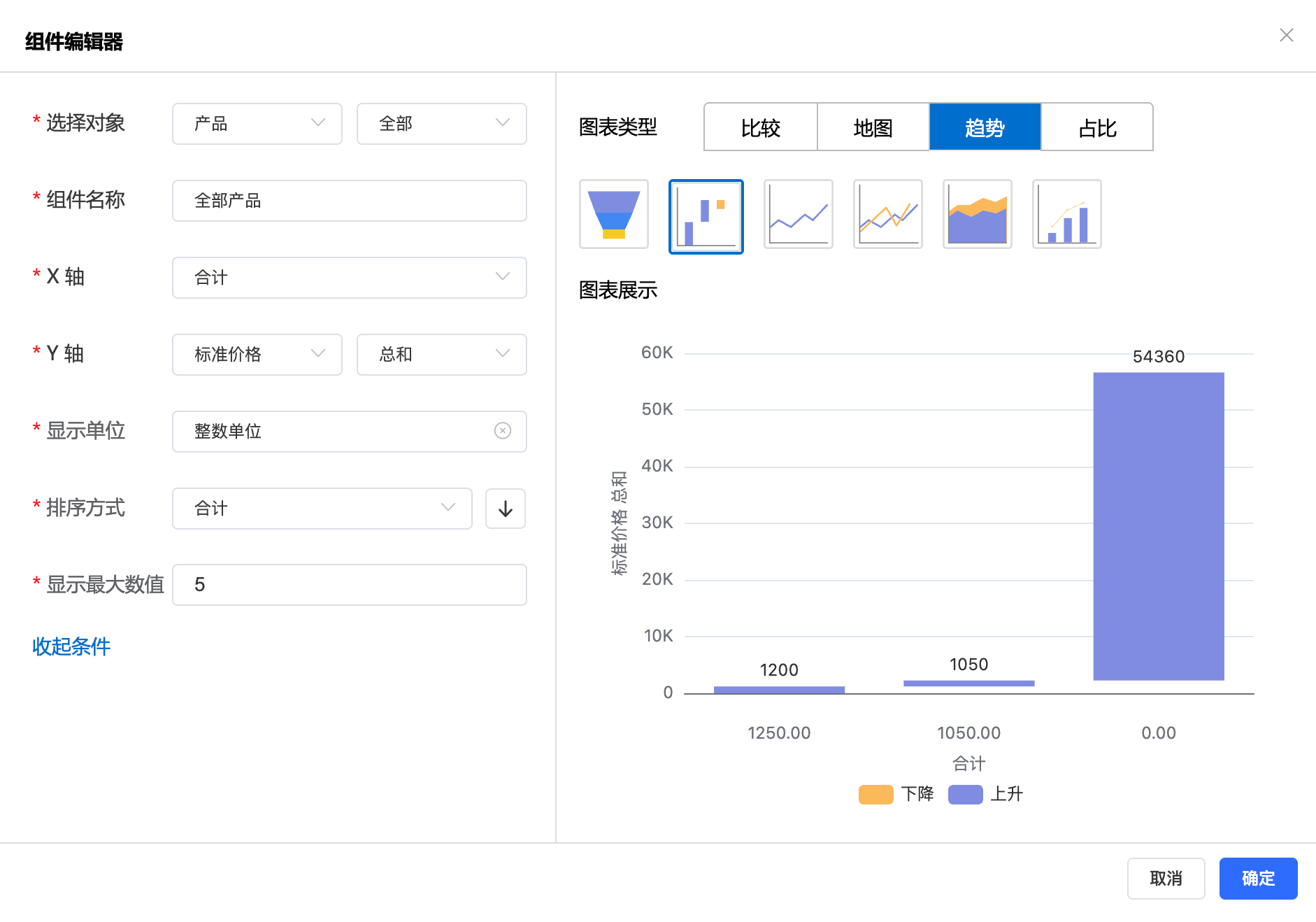| 格式化信息 | 显示单位:统计数据按什么数字单位显示,整数单位代表无单位 排序方式:按统计值还是一级分组值排序,升序还是降序 显示最大数量:最多展示二级分组个数 |