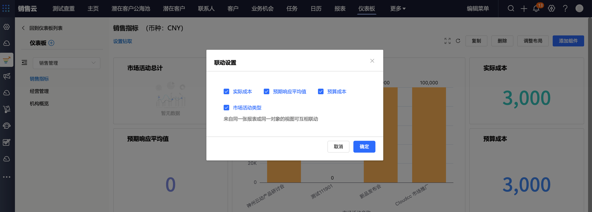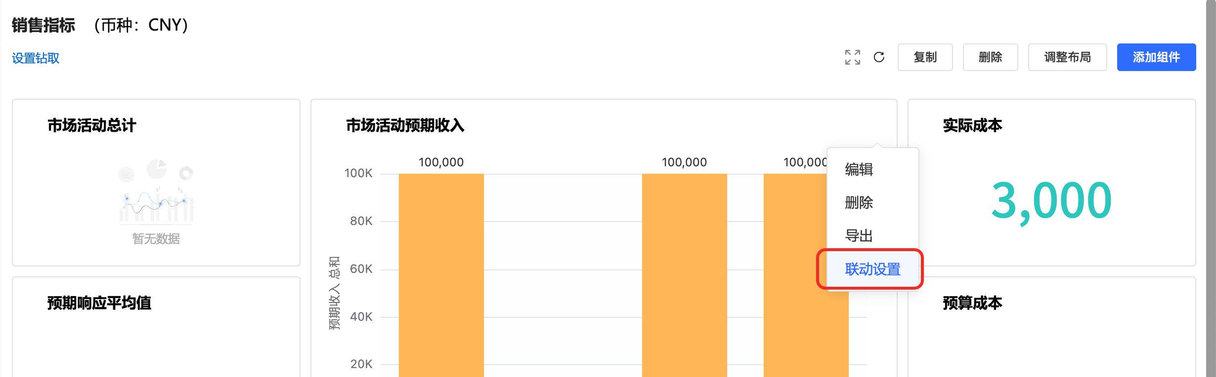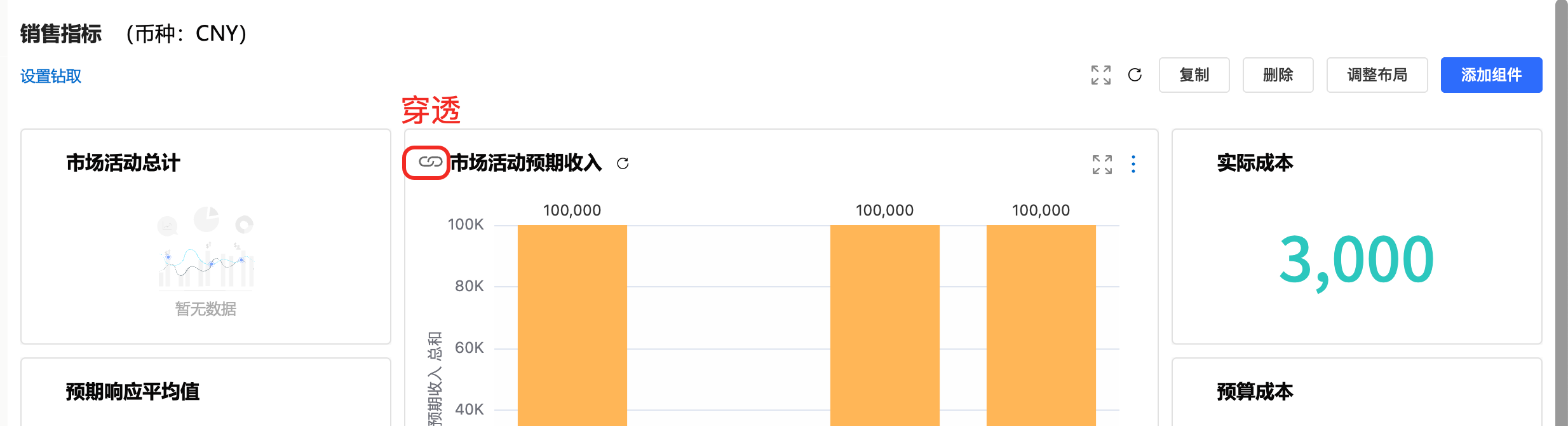 1.每个图表都可以设置联动和穿透,穿透是指穿透到图表所在的数据源,即原始报表和相应的列表视图。