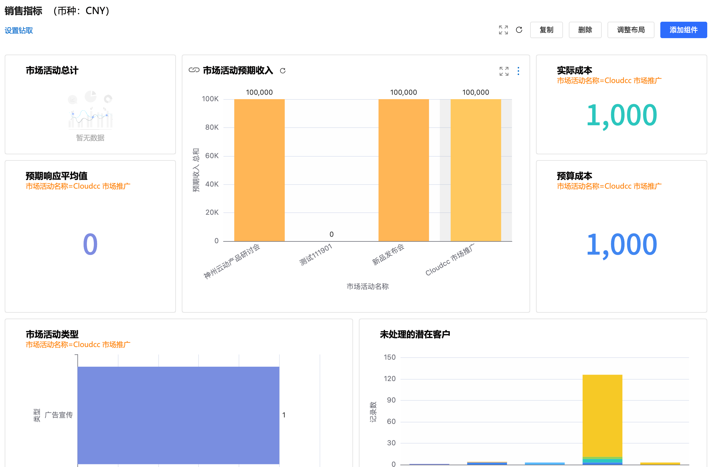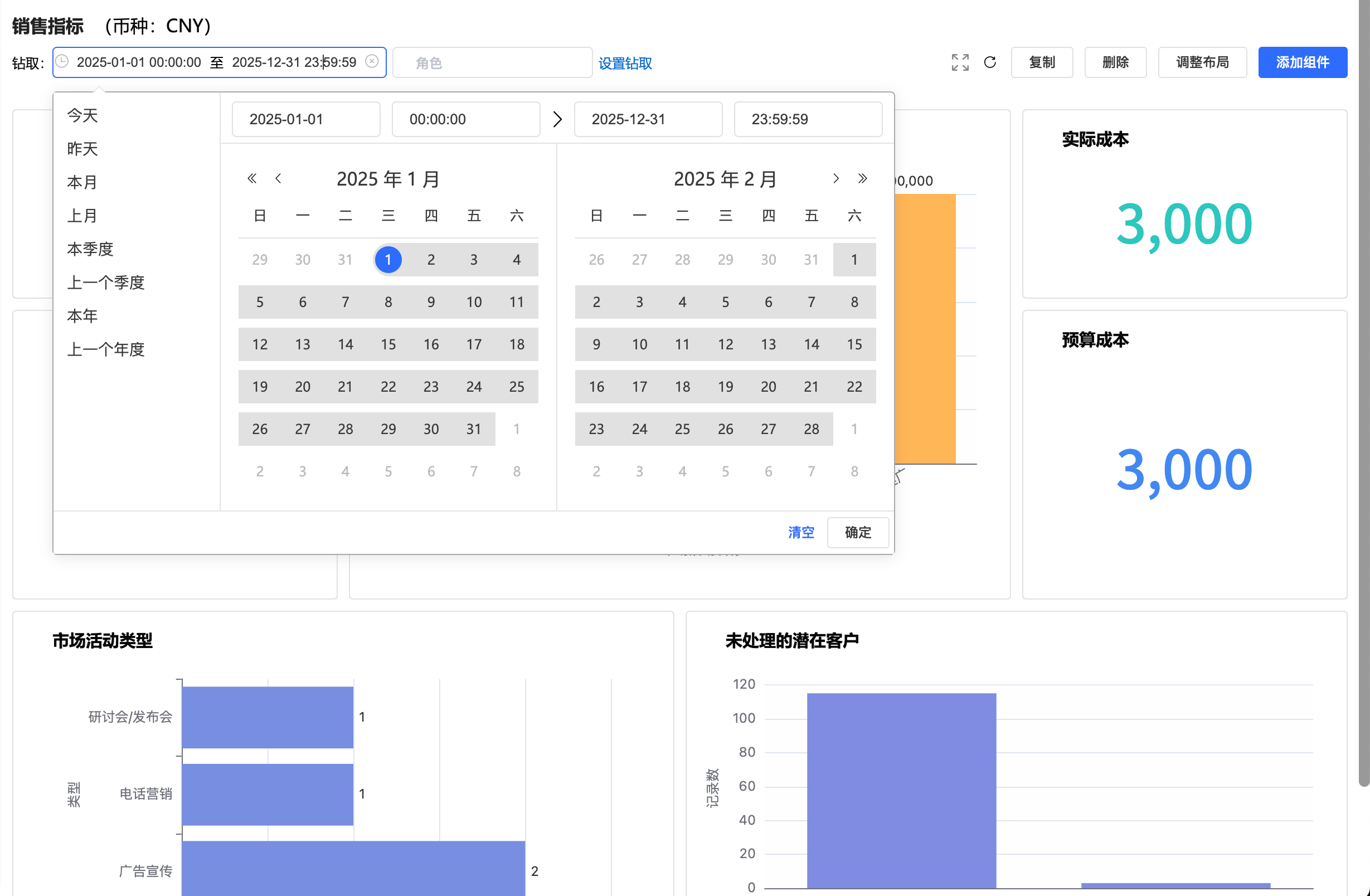 1.对仪表板内每个图表,都可以分别设置一个时间钻取条件和用户钻取条件。