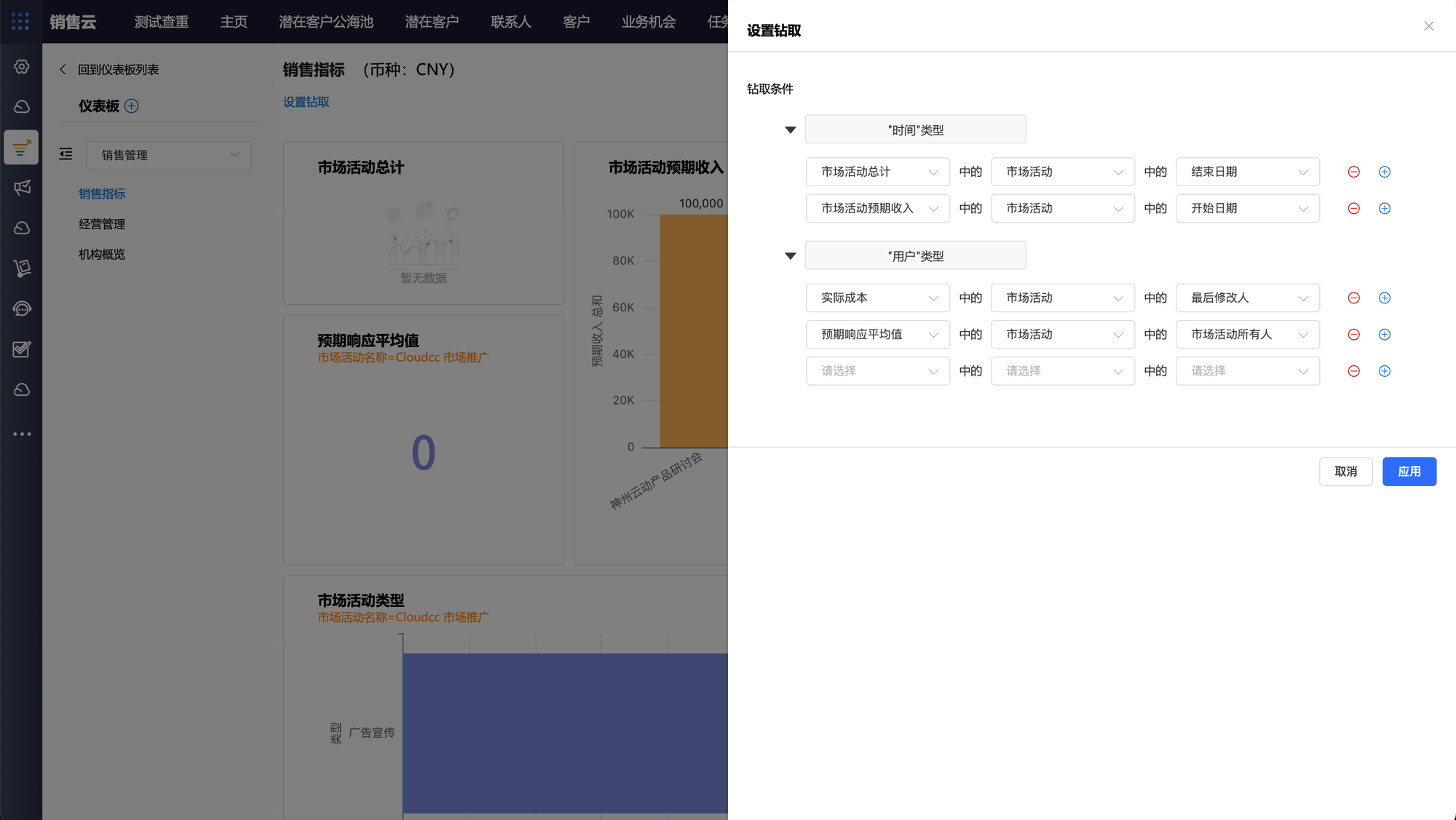 2.设置好钻取条件之后,可以通过仪表板左上方的钻取条件,在钻取条件范围下查看数据。