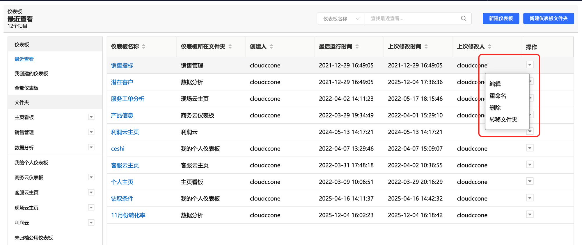 仪表板首页点击单条仪表板右侧的下拉框,能够进行重命名、编辑、删除、 转移文件夹等操作。
