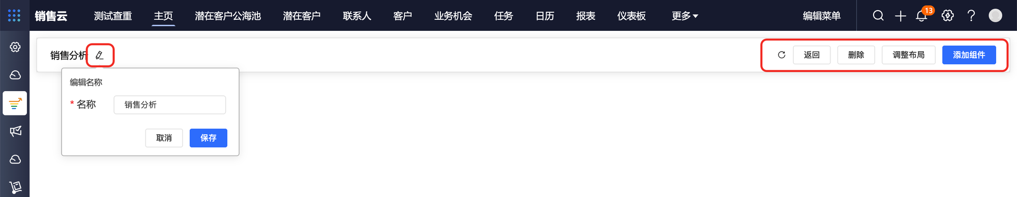 新建首页后,在该页面可以编辑名称;操作按钮区域支持返回、删除、调整页面布局和添加相关组件。