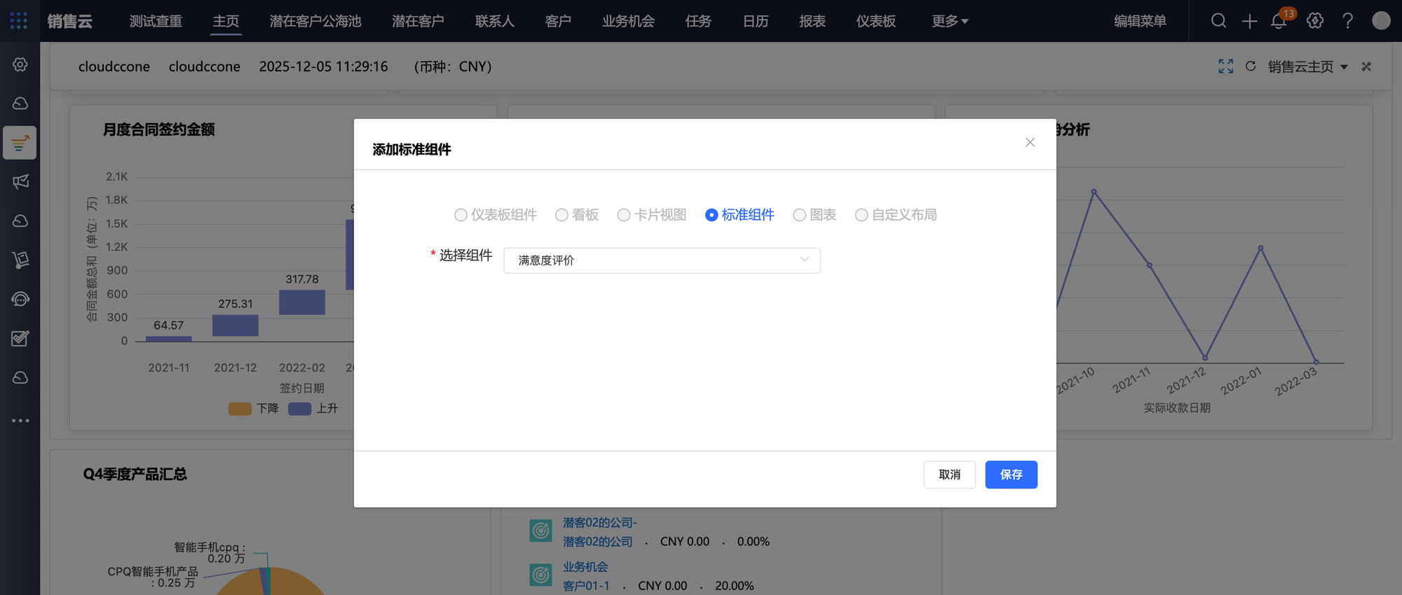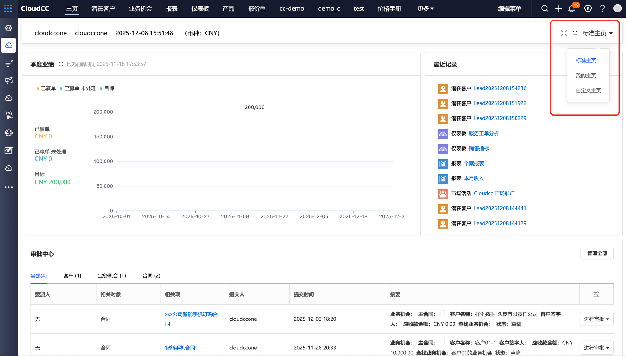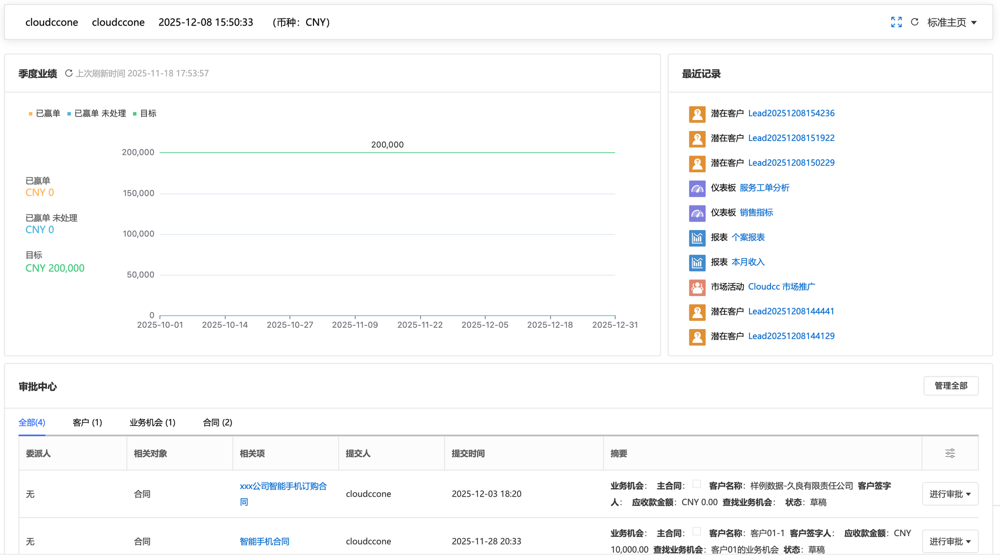 • 标准主页的内容是统一不可编辑的。包括季度业绩组件、最近查看组件、审批中心组件、今日事件组件、任务组件、已逾期的业务机会组件、最近 30天未 联系的业务机会组件、临近的业务机会组件。