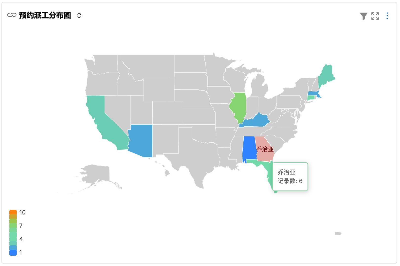 | 基础项配置 | 分组:只可选地址字段中的省或市字段 统计值:想要显示的统计数据 统计方式:统计值的统计方式,有总和、平均值、最大值、最小值4种 |