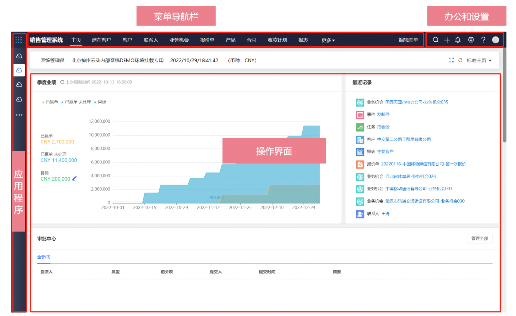 | 菜单导航栏 | 菜单:相应导航栏内设置的所有标准业务对象以及用户自定义业务对象,如客户、业务机会、合同、报表、仪表板等 |