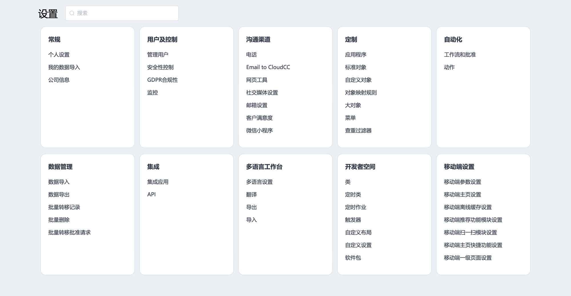1.登录 CloudCC 前台页面,在右侧办公和设置栏中单击设置按钮进入系统设置,系统设置选项只对管理员可见。